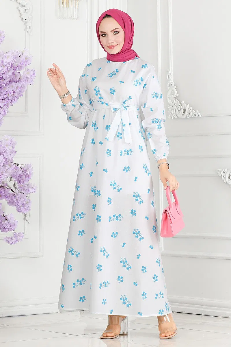 Beli Lastikli Desenli Elbise model tesettür ürünüdür. Dört Mevsim sezonunda kullanılabilir. 30 derecede sıkma yapılmadan yıkanmalıdır. Birinci sınıf Terikoton kumaştan imal edilmiştir. Ürün Bisiklet yakadır. Astarsızdır. (Modelin üzerindeki ürün M bedendir.) Boy: 160 cm, Göğüs: 82 cm, Bel: 68 cm, Basen: 96 cm, Kilo: 53 kg. Kemerin dalgalanmaması için iki ucu dikilmiş, orta kısım boş (dikişsiz) bırakılmıştır. Kemer ürüne dahildir, isteğe bağlı kullanılmayabilir. Beli ve manşeti lastiklidir.