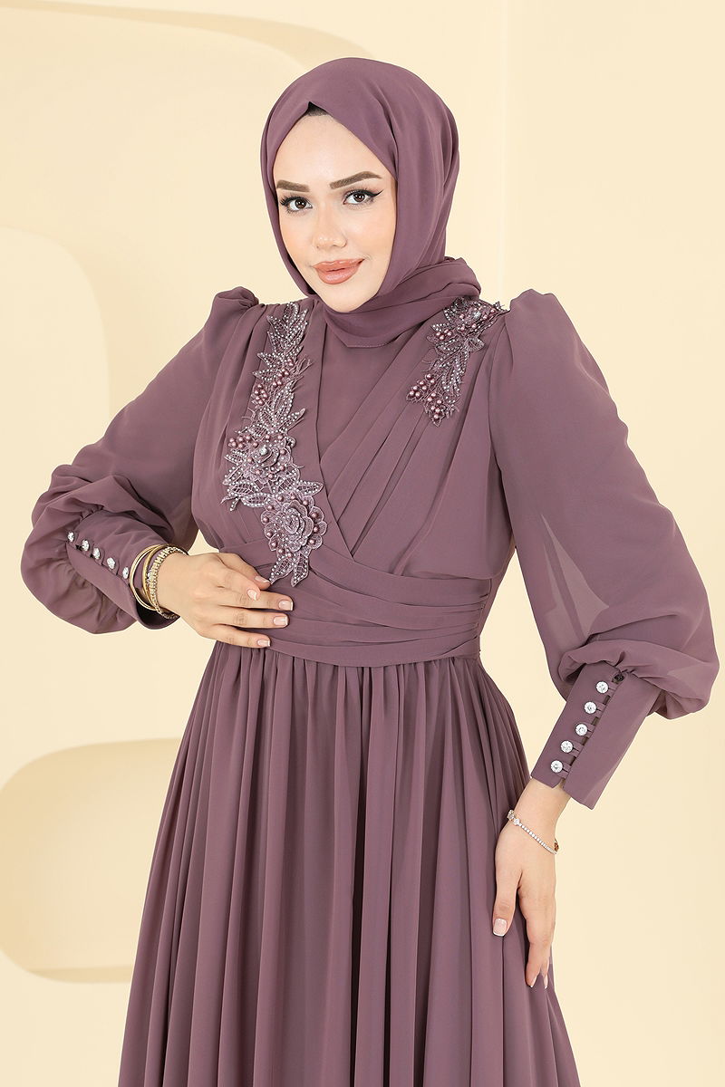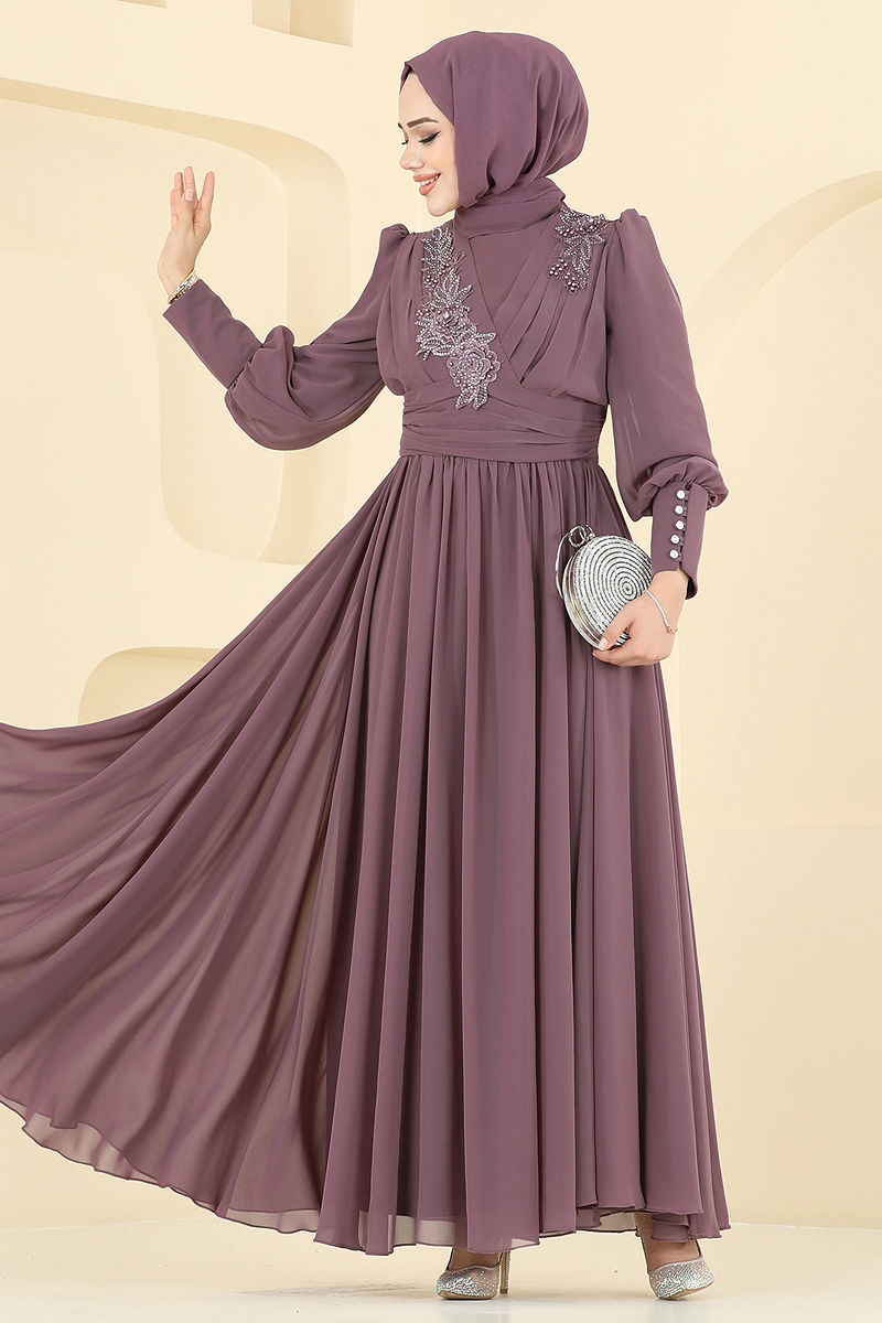 Beli Pilise Detaylı Şifon Abiye 8084AB368 Pudra Vizyon