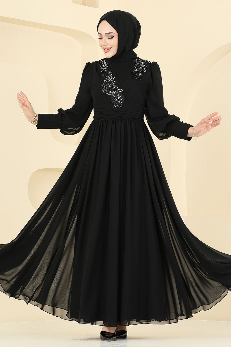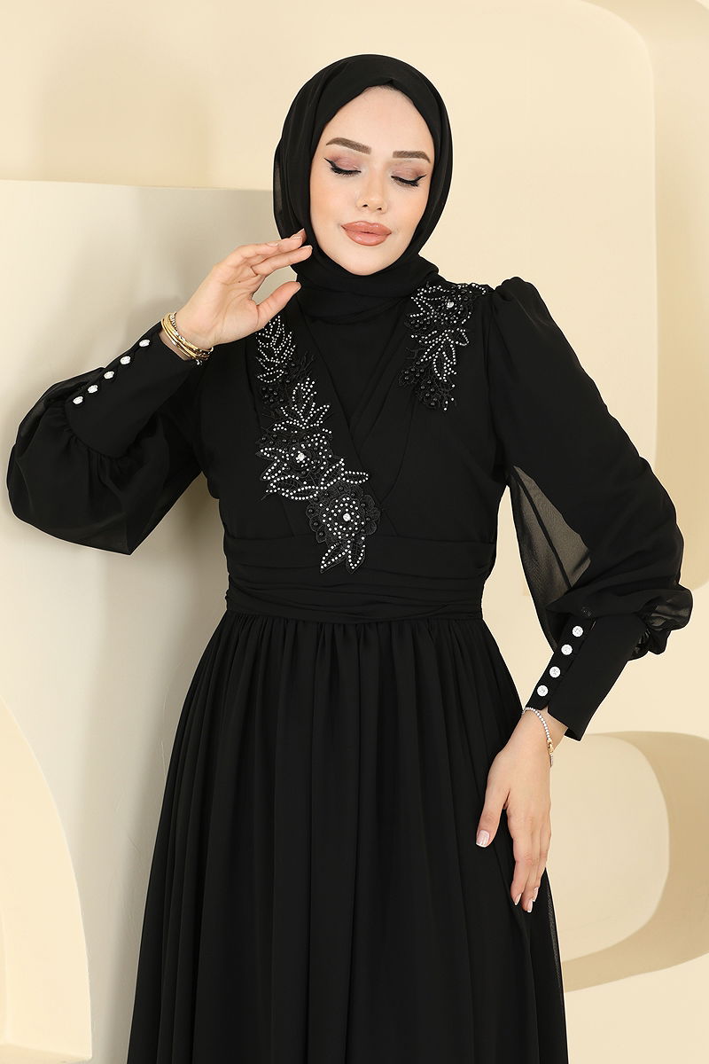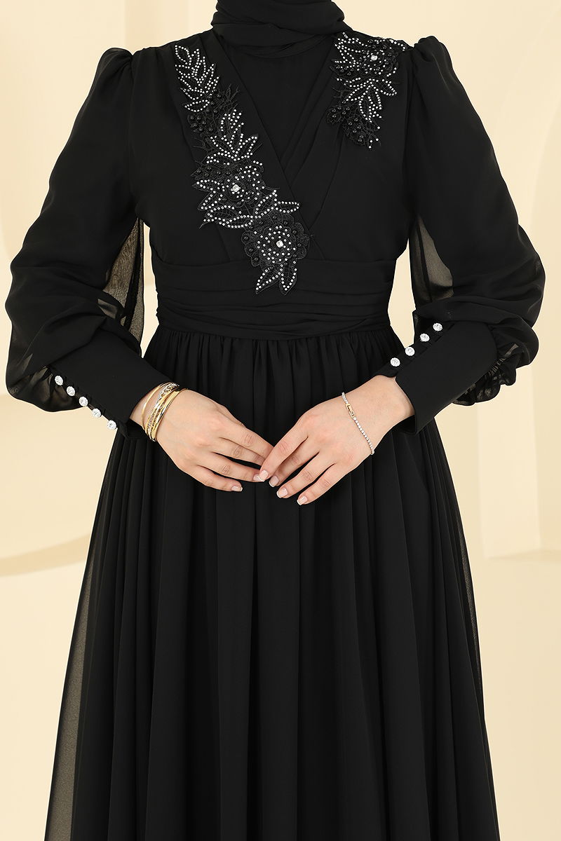 Beli Pilise Detaylı Şifon Abiye Siyah