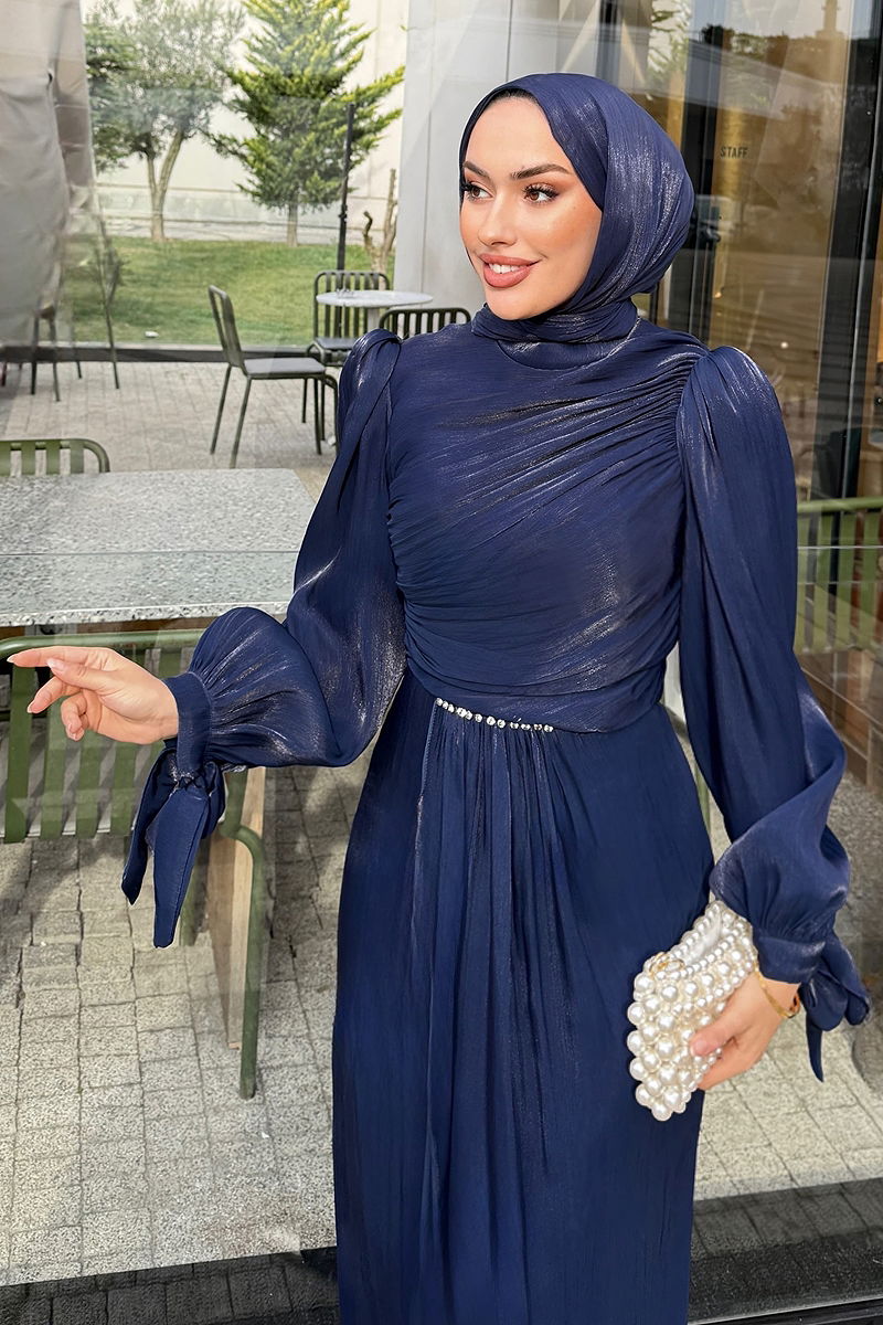 Beli taş detaylı bu şık abiye, özel günlerinizde zarif bir görünüm kazanmanızı sağlar. ABİYE modeli tesettür tarzıyla dört mevsim rahatlıkla kullanılabilir. Yalnızca kuru temizleme ile temizlenmesi gereken bu ürün, yarım hakim yaka ve astarlı tasarıma sahiptir. Sırttan fermuarlı olan abiye, üzerinde çakım kristal taşlarla dekore edilmiştir ve manşetleri bağcıklıdır. Modelin üzerindeki ürün 38 bedendir.