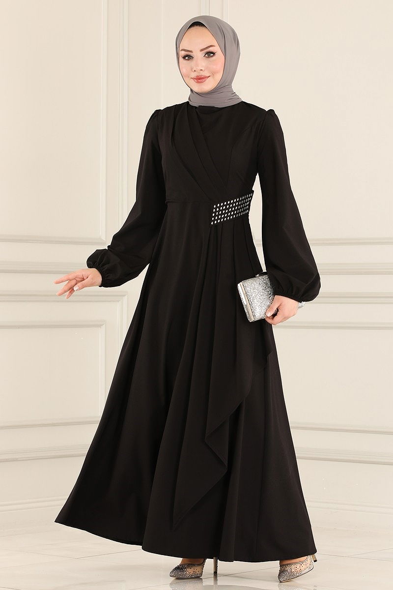 Beli Taş Detaylı Abiye Elbise Siyah