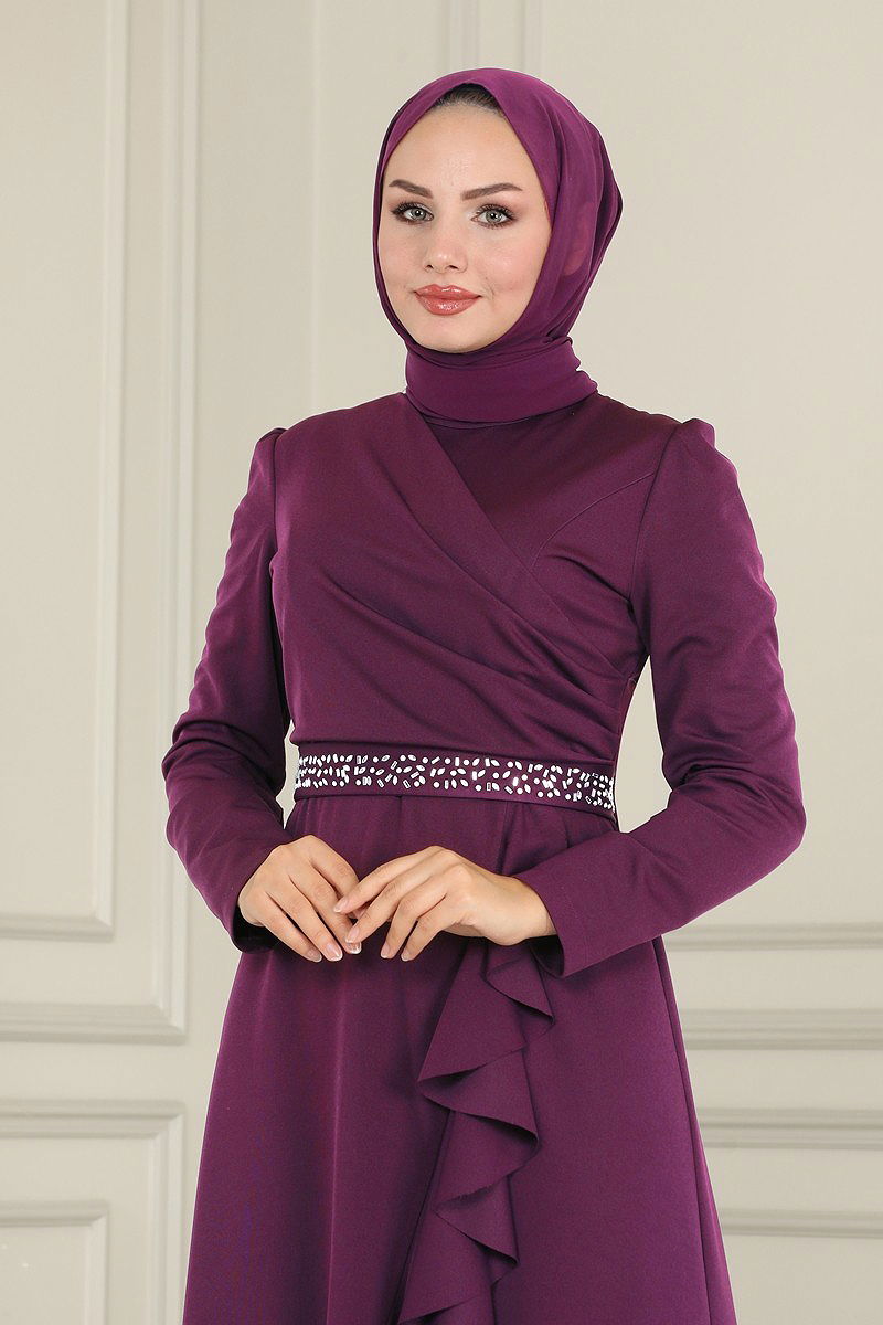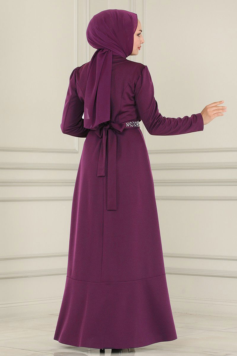 Beli Taşlı Abiye Elbise Koyu Mürdüm