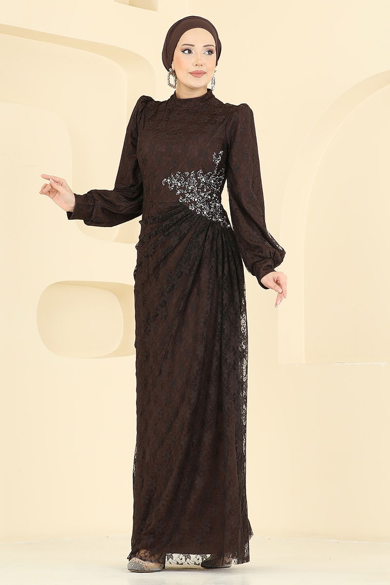 Beli Taşlı Dantel Abiye 5739EDF311 Kahve