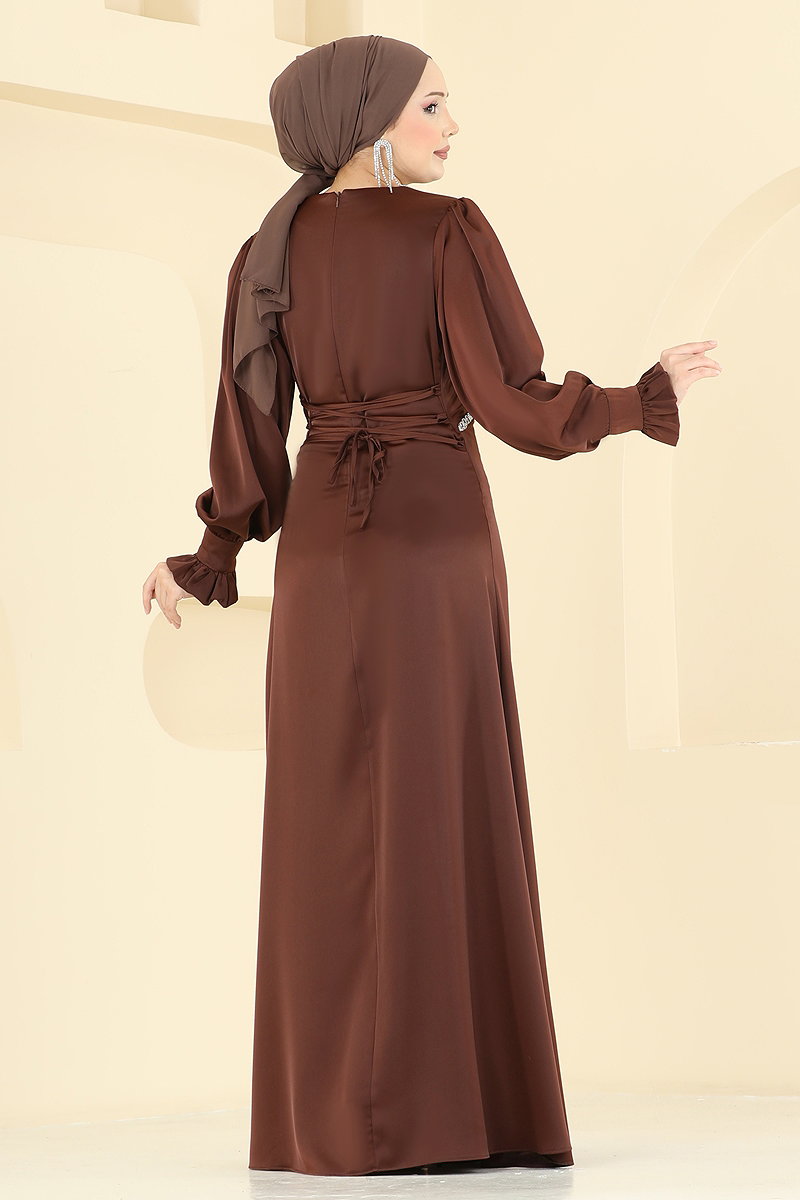Beli Taşlı Saten Abiye 6247BSK463 Kahve