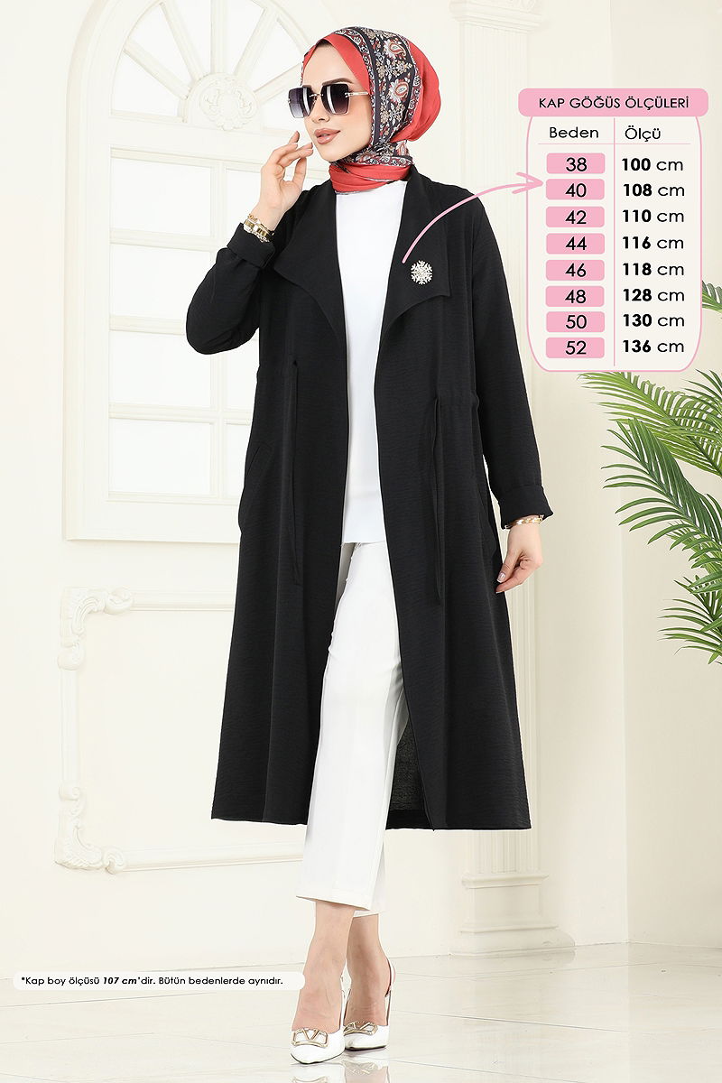 Beli Tünelli Aerobin Kap, tüm yıl boyunca rahatlıkla kullanabileceğiniz, özellikle dört mevsim sezonuna uygun bir tesettür ürünüdür. Aerobin kumaş kullanılarak üretilmiş olan bu ürün, 30 derecede hassas yıkama ile temizlenebilir. Kruvaze yaka tasarımı, astarsız yapısı ve bağcıklı beli ile hem rahat hem de şık bir alternatif sunar. Ürünün modeli 38 beden olup, boy: 165 cm, göğüs: 88 cm, bel: 68 cm, basen: 99 cm, kilo: 56 kg ölçülerindedir. Ürüne dahil olmayan aksesuarlar ve bulunan cepler, kullanım kolaylığı ve tarz sahibi bir görünüm sağlar.