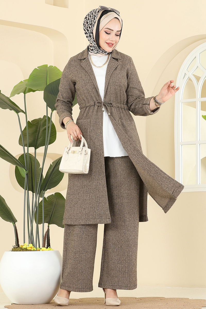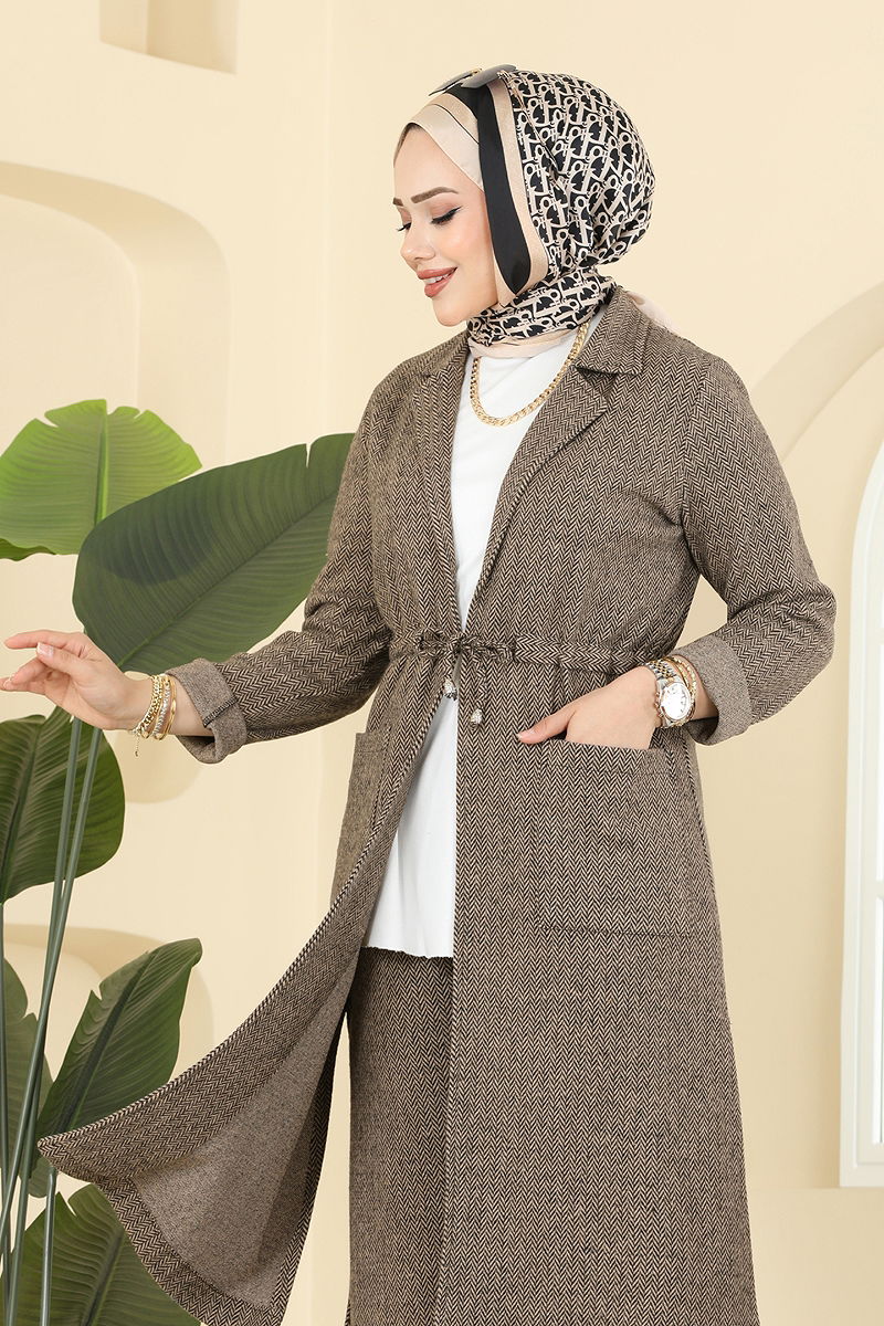 Bu şık ve modern Beli Tünelli Balıksırtı Takım KOMBİN, tesettür giyim koleksiyonunuz için mükemmel bir seçenektir. Sonbahar ve kış aylarında konfor ve şıklığı bir arada sunan bu ürün, hassas kumaş yapısı sayesinde 30 derecede yıkanabilir özelliğe sahiptir. Balıksırtı desenli kumaşı, kruvaze yaka detayı ve astarsız yapısı ile dikkat çekerken, beli bağcıklı ve pantolonu lastikli tasarımı gün boyu rahat bir kullanım sunar. Hem kap hem de pantolonunda bulunan cepler ise fonksiyonellik katmaktadır.