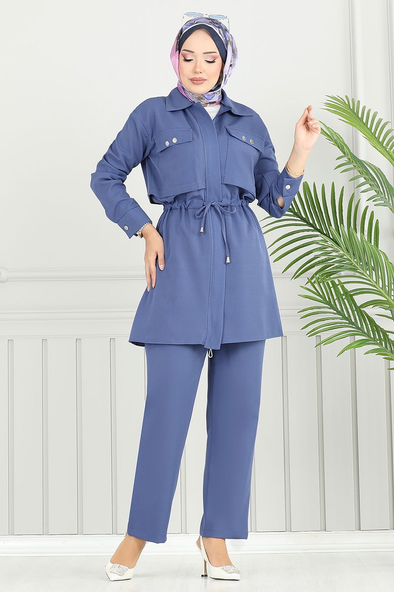 Ürün Özelliği : Yeni sezon tesettür moda ürünüdür. Beli bağcıklıdır. Ürün Gömlek yakadır. Astarsızdır. Ürün Önden fermuarlıdır. Göğüs cep aktiftir. Pantolon beli lastiklidir.Konsept fotoğraf çekimlerinden dolayı üründe ton farklılığı olabilir.