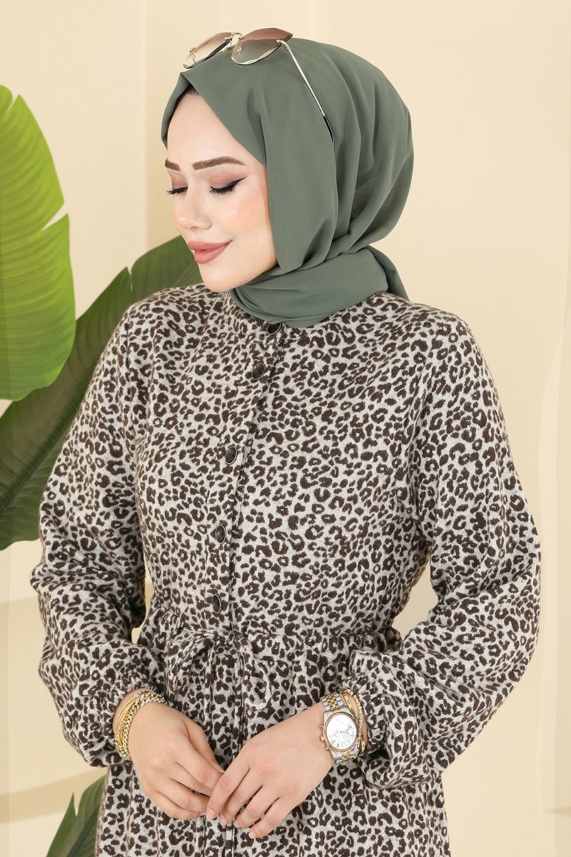 Beli Tünelli Desenli Elbise Kahve