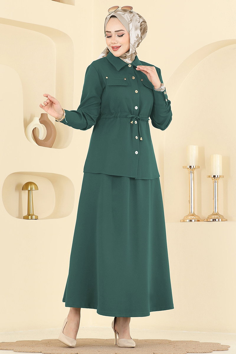 Ürün Özelliği : Yeni sezon tesettür moda ürünüdür. Beli bağcıklıdır. Ürün Gömlek yakadır. Ürün Önden düğmelidir. Astarsızdır. Düğme detaylarında desen farklılıkları görülebilir. Cep detayı aksesuardır. Etek beli lastiklidir. Manşet düğmeleri aktiftir. Konsept fotoğraf çekimlerinden dolayı üründe ton farklılığı olabilir.