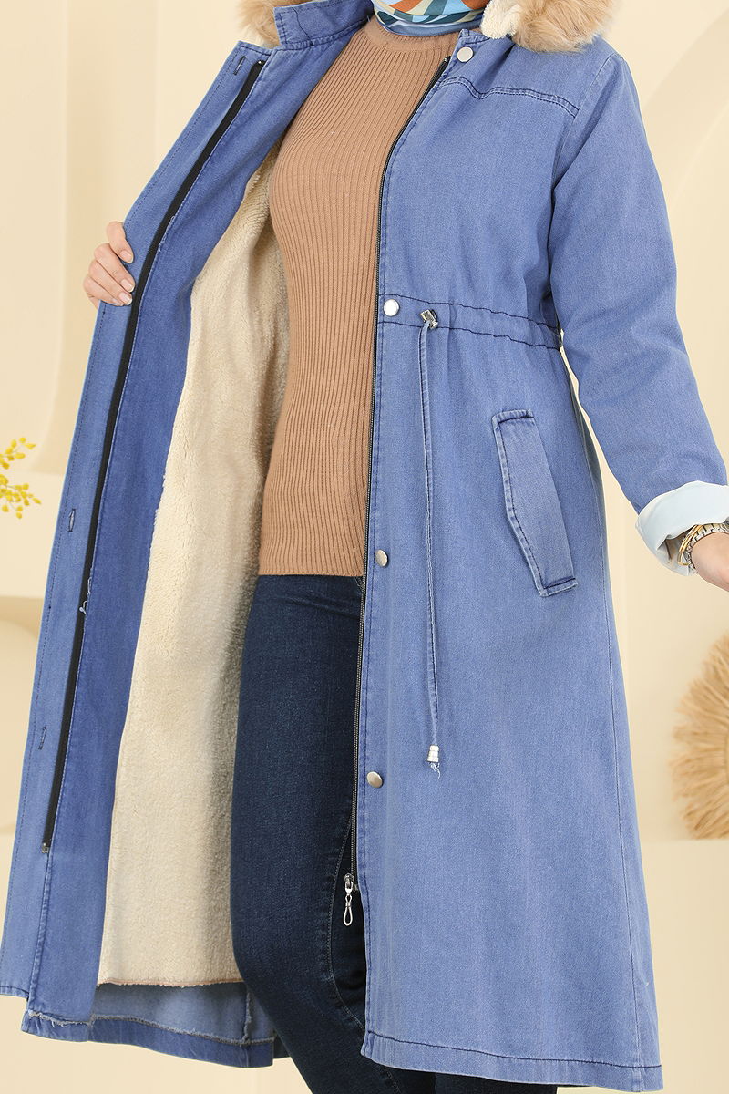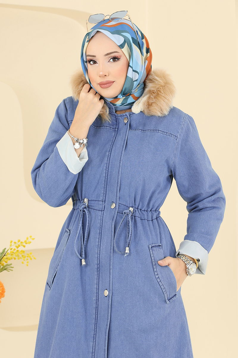 Beli Tünelli Kot Kap Kaban, tesettür tarzına uygun, sonbahar ve kış sezonlarında rahatlıkla kullanılabilir. Yüksek kaliteli kot ve kürk kumaş blendi ile üretilmiş olan bu kap, gizli düğmeler ve bağcıklı bel tasarımıyla kullanışlı bir yapı sunar. Detaylarda kürklü astar ve çıkarılabilir kapüşon bulunmaktadır. Ürüne zarif bir dokunuş katan fermuar ve cep detaylarıyla fonksiyonellik artırılmıştır. 30 derecede hassas yıkama ile temizlenebilir.