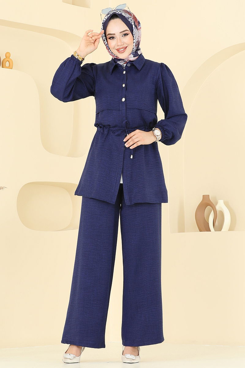 Beli Tünelli Sofia Takım, stil sahibi tesettür giyim için mükemmel bir seçenektir. Dört mevsim boyunca rahatlıkla kullanabilirsiniz, 30 derecede hassas yıkama ile temizlenmesi gerekmektedir. Keten kumaştan üretilen bu takım; gömlek yaka ve ön düğmeli tasarımıyla modern ve şık bir görünüm sunar. Ürün astarsızdır ve manşetleri lastiklidir. Tunik ve pantolon formundaki bu kombin, her türlü toplantı ve günlük kullanım için idealdir. Bluz ürüne dahil değildir, bluz ile yapılan kombin sadece görsel amaçlıdır. Pantolonun beli elastik tasarıma sahiptir, bu sayede maksimum konfor sağlar.
