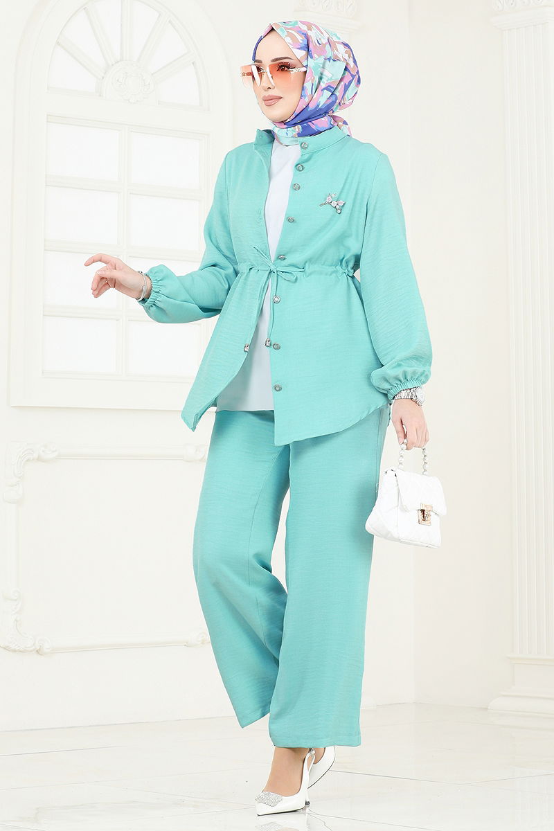 Ürün Özelliği : Yeni sezon tesettür moda ürünüdür. Beli bağcıklıdır. Ürün Yarım Hakim yakadır. Ürün Önden düğmelidir. Astarsızdır. Aksesuarlar ürüne dahil değildir. Bluz ürüne dahil değildir. Ürün kullanım amacını göstermek için bluz ile örnek kombin yapılmıştır. Pantolon beli lastiklidir. Manşeti lastiklidir. Konsept fotoğraf çekimlerinden dolayı üründe ton farklılığı olabilir.