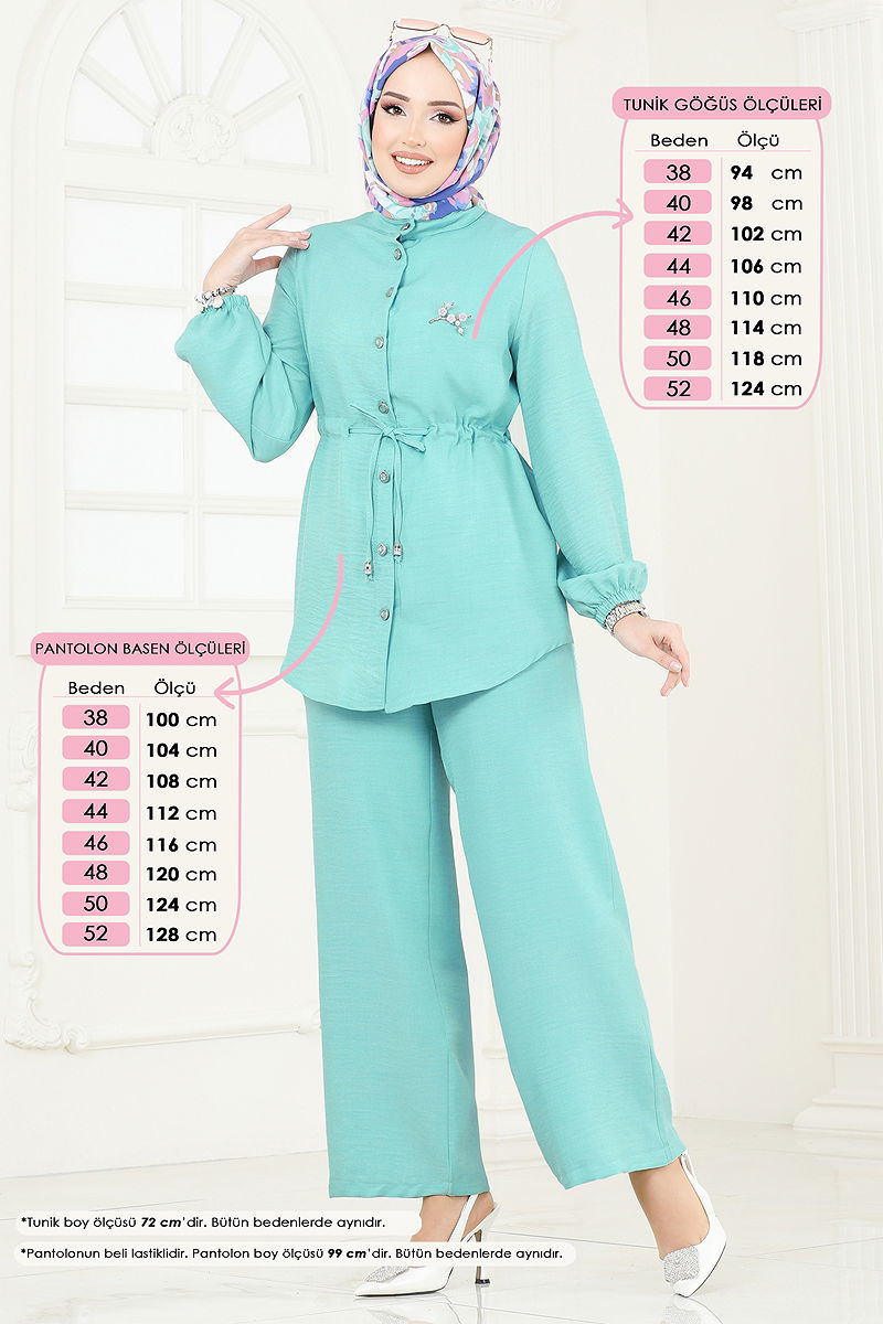 Beli Tünelli Keten Takım , zarif tesettür giyim sunan modern bir seçenektir. Dört mevsim boyunca kullanabileceğiniz bu takım, 30 derecede hassas yıkama ile temizlenebilir. Sofia keten kumaşından üretilen tunik, ön düğmeli ve yarım hakim yaka tasarımına sahiptir. Astarsız olup, rahatlığı artıran beli bağcıklıdır. Pantolon ise beli lastikli olmakla birlikte, manşetleri de lastiklidir. Bu zincir takım içerisinde, aksesuarlar dahil değildir. Şık, rahat ve fonksiyonel bu takım, her dolabın vazgeçilmez parçası olmaya adaydır.
