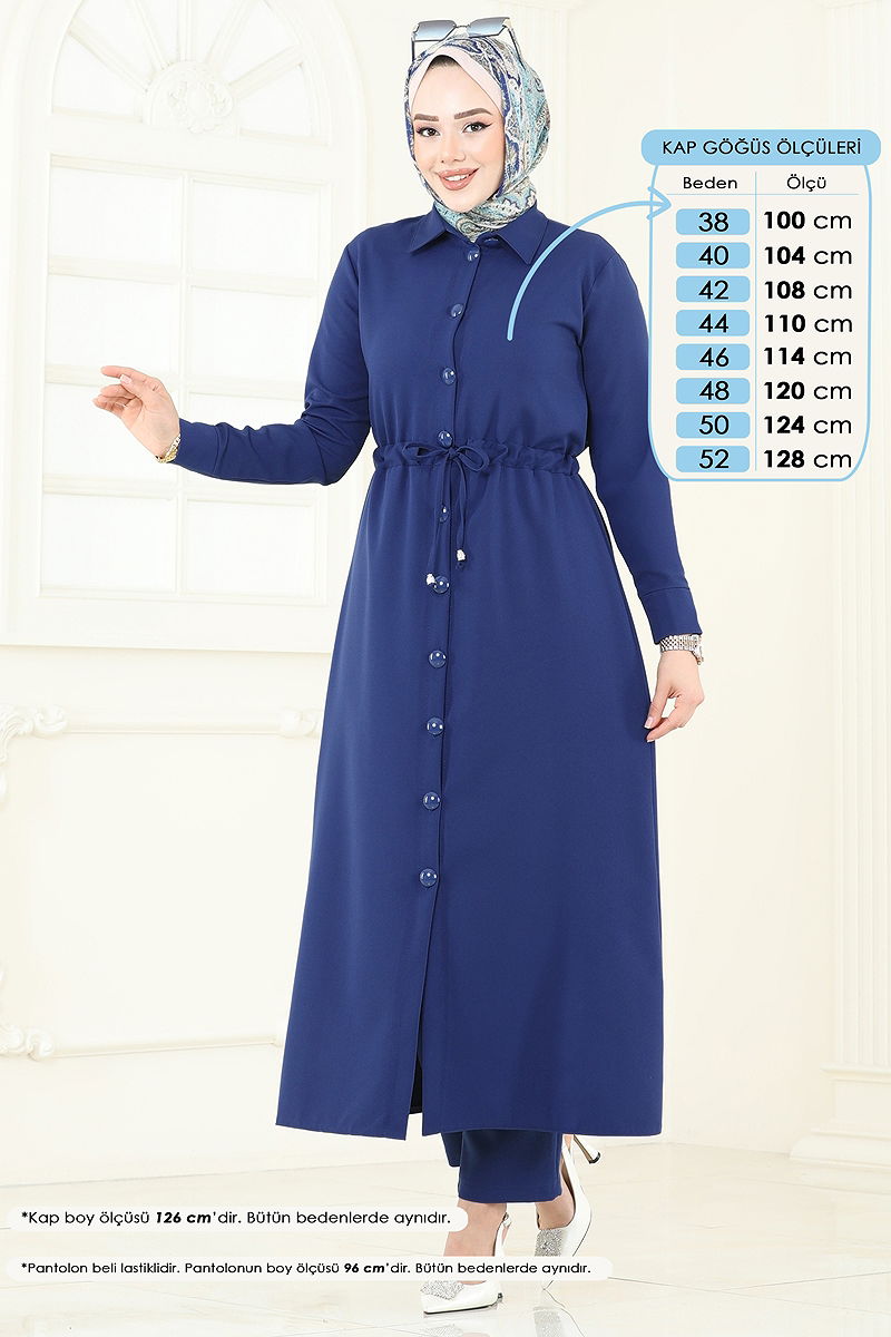 Ürün Özelliği : Yeni sezon tesettür moda ürünüdür. Beli bağcıklıdır. Ürün Gömlek yakadır. Ürün Önden düğmelidir. Astarsızdır. Bluz ürüne dahil değildir. Ürün kullanım amacını göstermek için bluz ile örnek kombin yapılmıştır. Pantolon beli lastiklidir. Konsept fotoğraf çekimlerinden dolayı üründe ton farklılığı olabilir.