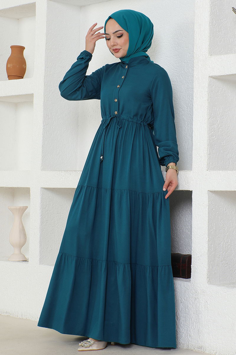 The Belted Tunnel Buttoned Viscose Dress offers a comfortable fit for all seasons. Made from viscose fabric, this modest dress stands out with its elegant bicycle neck and half-button details. Recommended to be hand washed, this dress features a drawstring waist and elastic cuffs, providing a stylish and comfortable look. This unlined model is perfect without compromising on style. (The product worn by the model is size 38.) Measurements: Height: 160 cm, Chest: 86 cm, Waist: 68 cm, Hip: 95 cm, Weight: 55 kg.