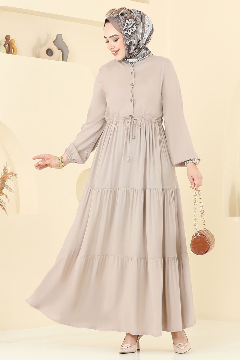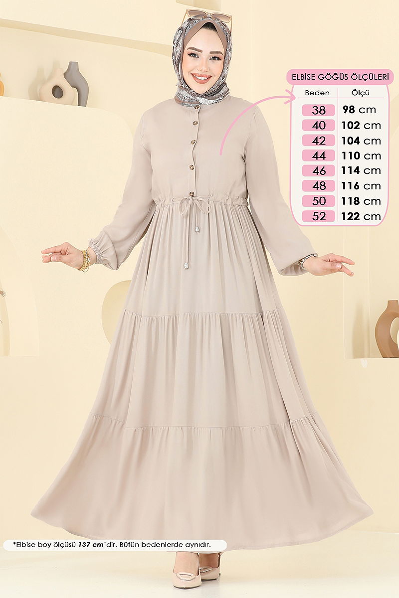 Beli Tünelli Düğmeli Viskon Elbise, dört mevsim keyifli bir kullanım sunar. Viskon kumaştan üretilen bu tesettür elbise, zarif bisiklet yakası ve yarım düğme detayları ile dikkat çeker. Elde yıkama önerilen bu üründe, beli bağcıklı ve manşetleri lastikli olarak tasarlanmıştır. Astarsız olan bu model, rahat ve şık bir görünüm sunar. (Modelin üzerindeki ürün 38 bedendir.) Ölçüler: Boy: 160 cm, Göğüs: 86 cm, Bel: 68 cm, Basen: 95 cm, Kilo: 55 kg.