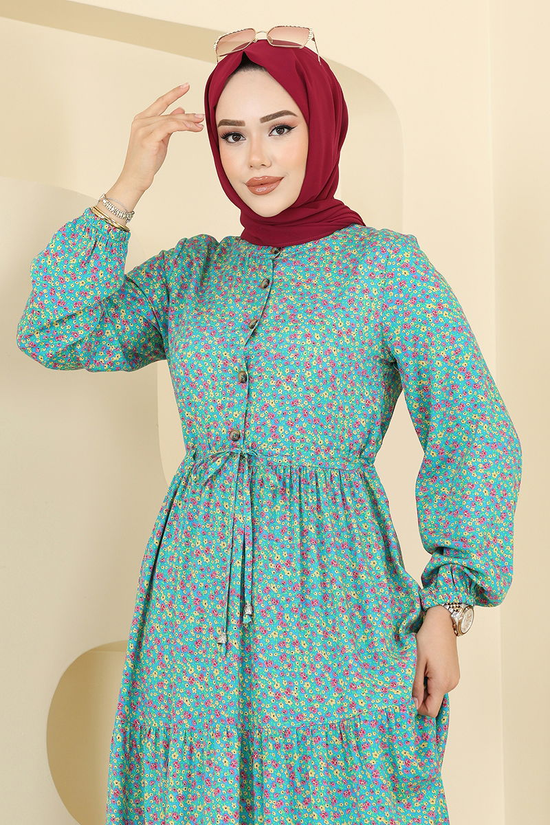 Beli Tünelli Viskon Elbise 7136ERK1158 Turkuaz