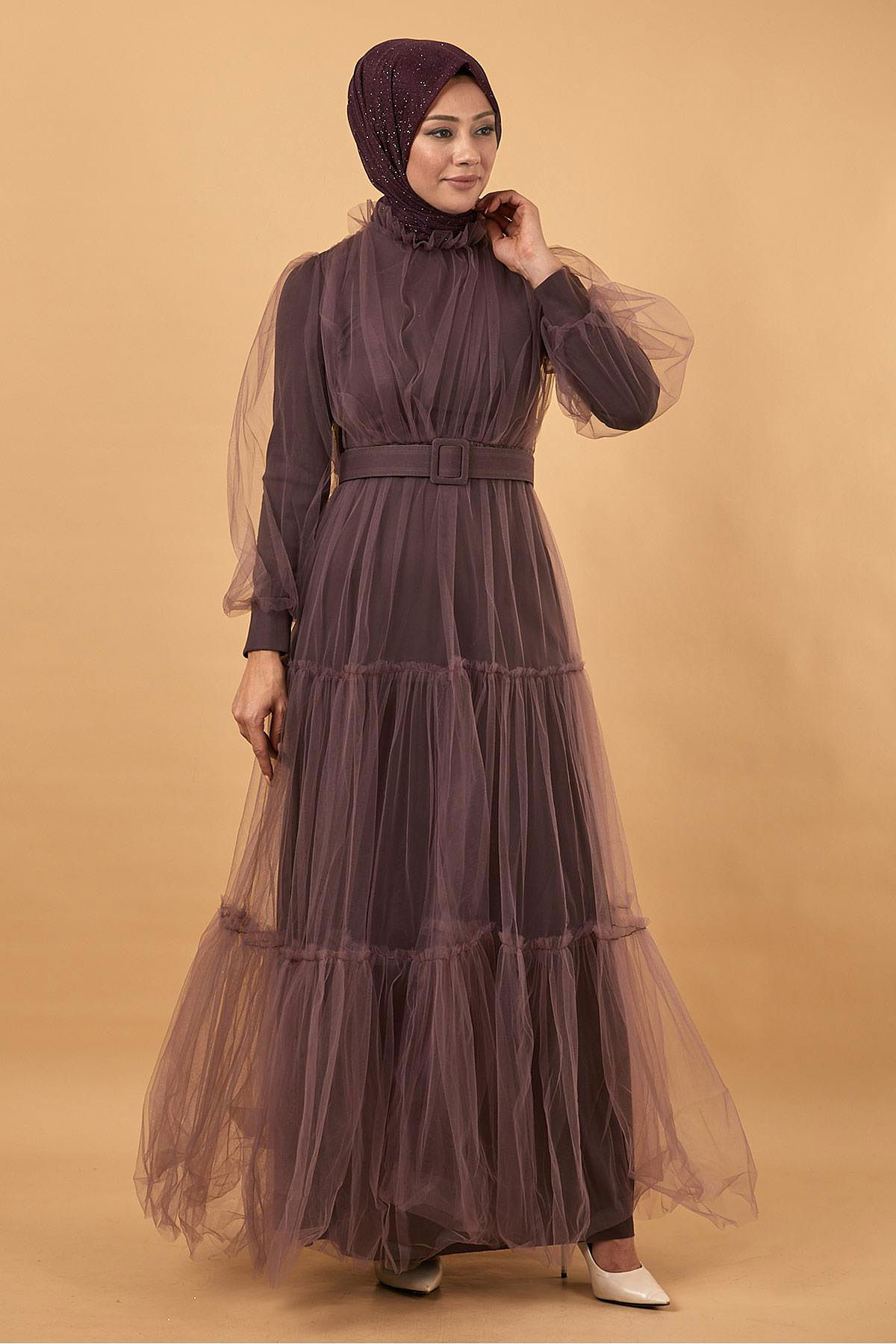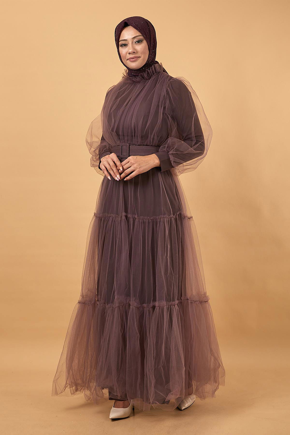 Belted Tulle Evening Dress MİH12217-M Rose Dry