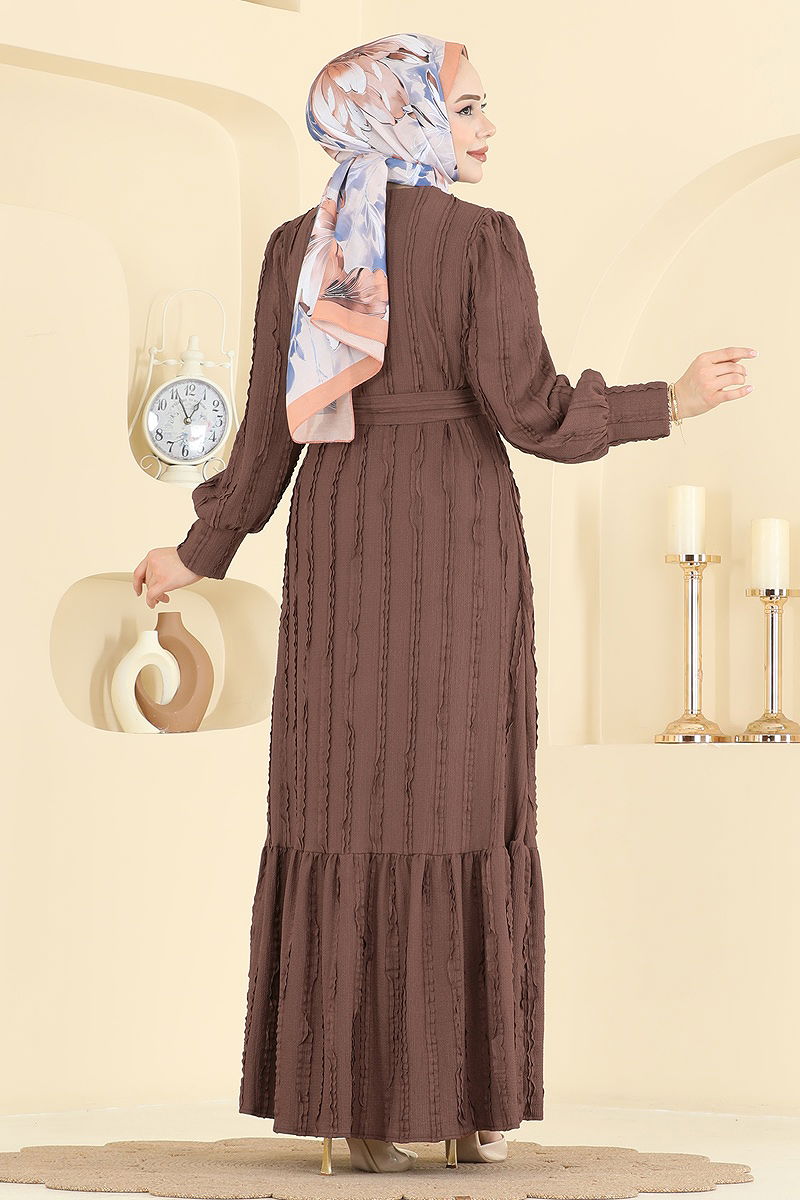 Detaylarıyla öne çıkan Bisiklet Yaka Detaylı Elbise, tesettür giyim için ideal bir seçenektir. Dört mevsim rahatlıkla kullanılabilir. Bisiklet yaka ve sırttan düğmeli tasarımıyla dikkat çekerken, astarsız yapısı ile konfor sunar. 30 derecede hassas yıkamaya uygun bu elbise, kemer detayı ile de stil sahibi bir görünüm kazandırır. Kemer, elbisenin kendi tasarımına dahil olup, isteğe bağlı olarak çıkarılabilir. Ürün 38 beden örneği ile sunulmuştur.