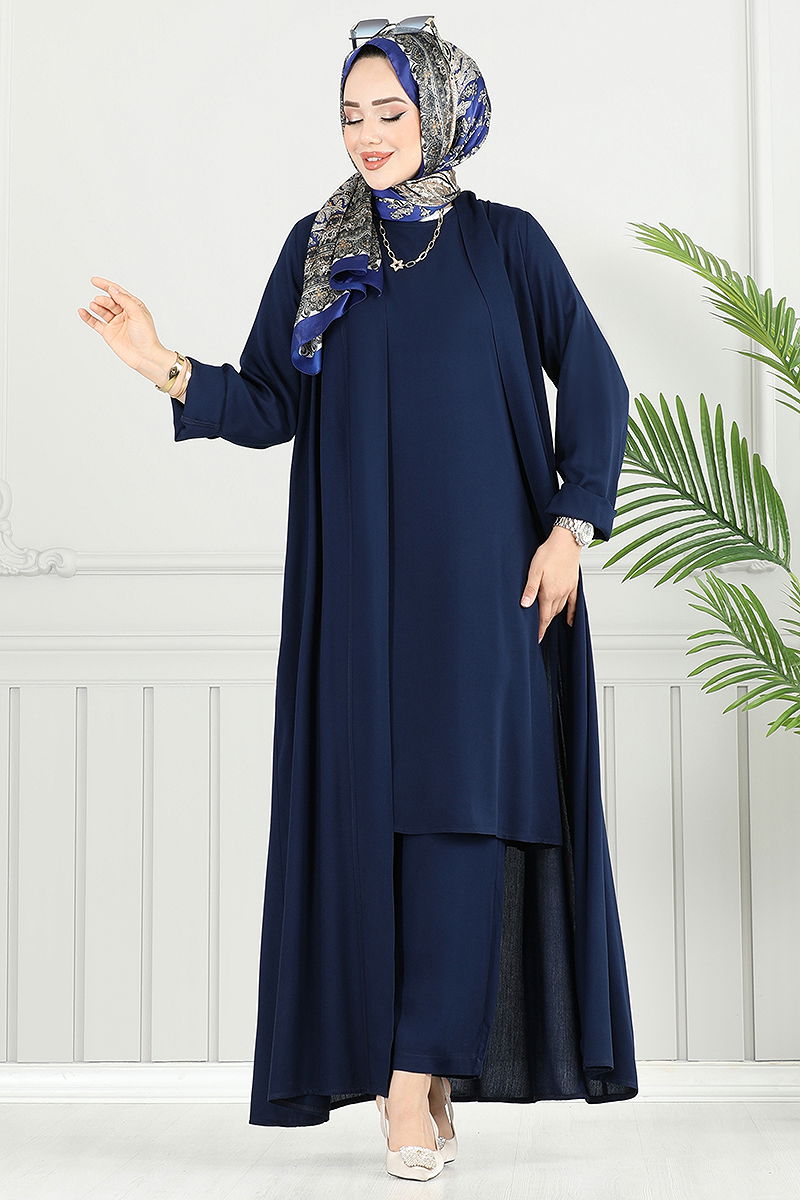 The Bicycle Neck Cardigan Set COMBINE is ideal for modest wear, offering comfort through all seasons. Easily washable at 30 degrees on a delicate cycle, it provides convenience. Made from viscose fabric, it offers a soft touch. Its bicycle neck and buttoned-back design give a modern look. The unlined structure, sleeveless inner blouse, and elastic waistband of the trousers increase comfort. CAP, BLOUSE, and TROUSERS are included in the set.