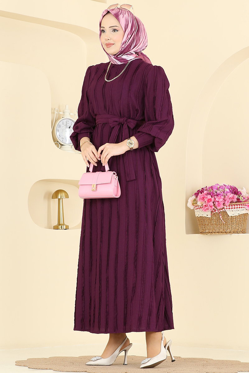 Bisiklet Yaka Kemerli Elbise 7166BG354 Mor