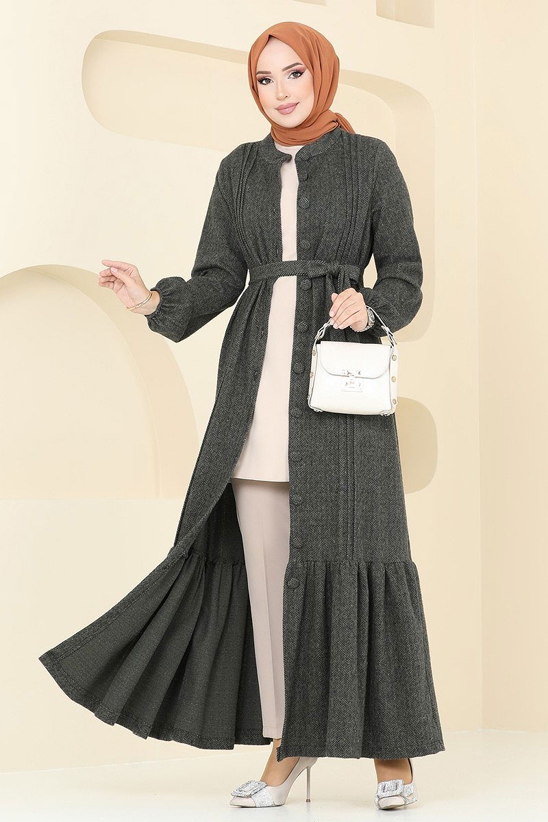 Biye Detaylı Balıksırtı Elbise Haki