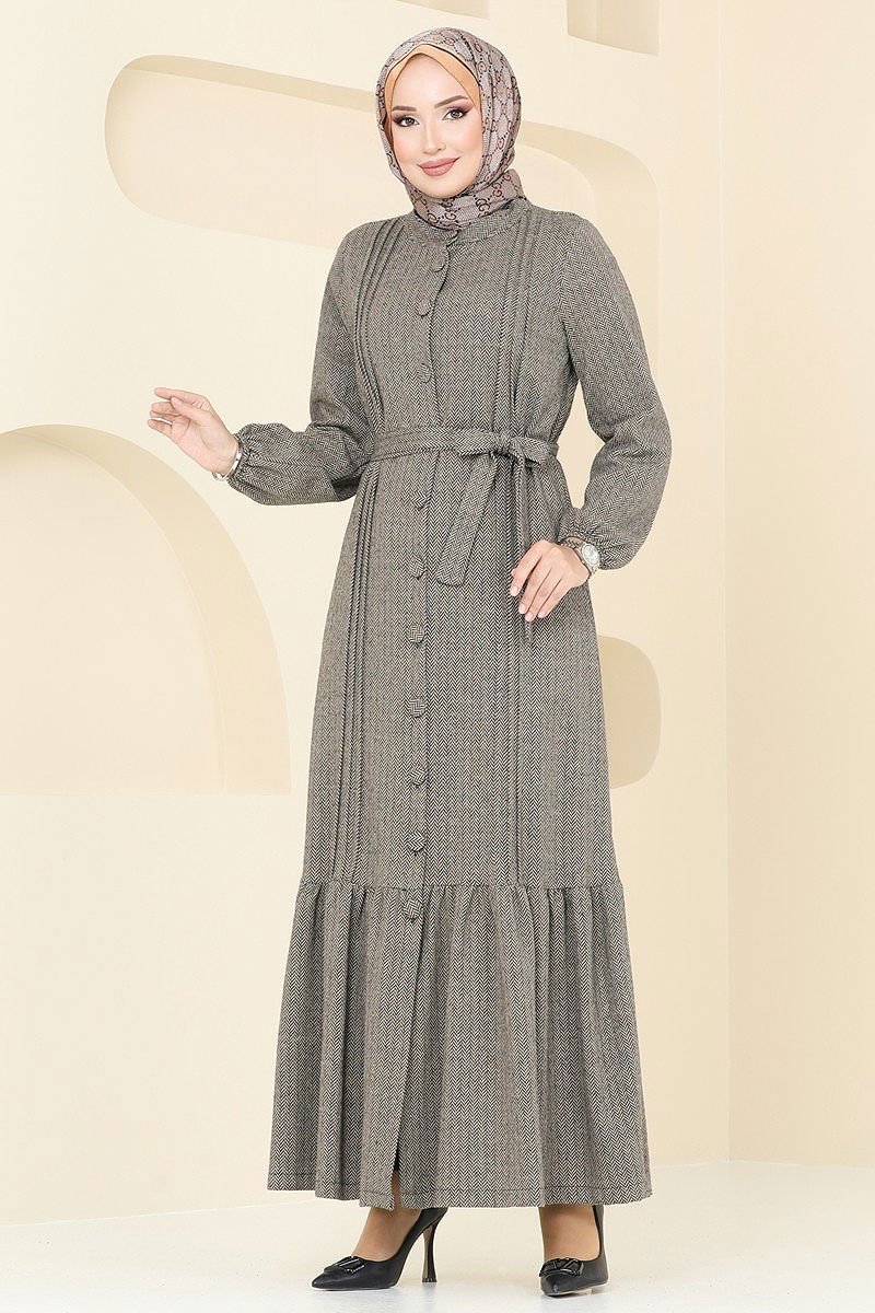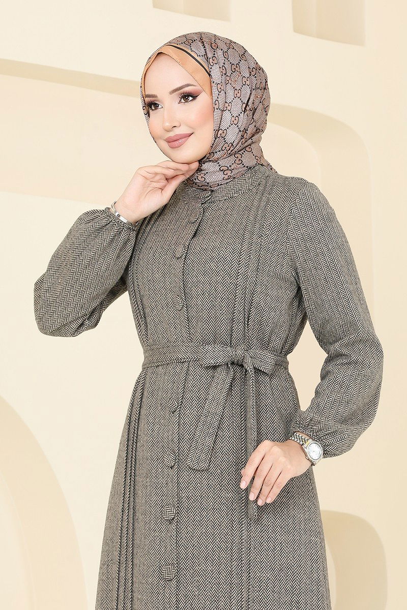 المنتج لديه ياقة نصف بيضوية. المنتج به أزرار من الأمام. غير مبطنة. الحزام متضمن، ،يمكن استخدامها حسب الرغبة السوار مطاطي. قد يكون هناك اختلاف في الدرجة اللونية في المنتج بسبب التقاط الصور الفوتوغرافية.