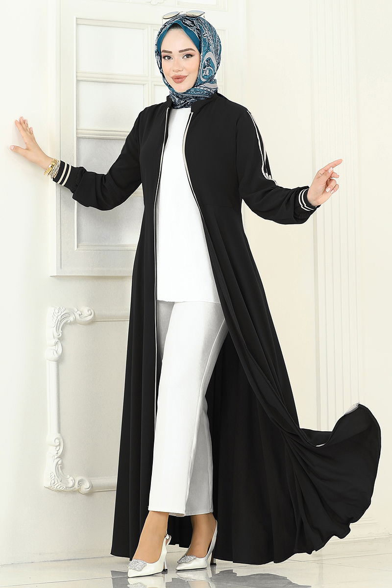 The Piped Detail Ferace is a stylish and practical garment designed specifically for women who prefer modest attire. Suitable for all seasons, this ferace can be washed at a gentle 30 degrees Celsius. Made from Medina silk fabric, this model offers a lightweight and comfortable experience without lining. The front zip design of the product adds a versatile elegance. It perfectly displays an ideal look with a standard size 38 on the model.