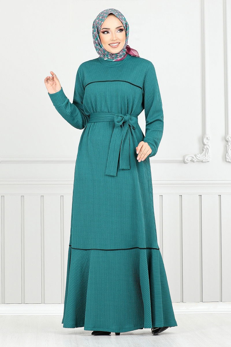 Biye Detaylı Kışlık Elbise, tesettür özellikli ve sonbahar ile kış aylarında rahatlıkla kullanabileceğiniz bir üründür. Hassas yıkama gerektiren bu elbise, 30 derecede yıkanabilir ve Kalın Fitilli kumaştan üretilmiştir. Bisiklet yaka tasarımına sahip olan bu model, astarsızdır ve kemer detayı ile şık bir görünüm sunar. Kemer, dalgalanmaları önlemek için iki ucu sabitlenmiştir ve isteğe bağlı olarak çıkarılabilir. Elbise, her türlü kışlık kombininize eşlik edecek zarif bir seçenektir.Elbise kafadan giyilmektedir.