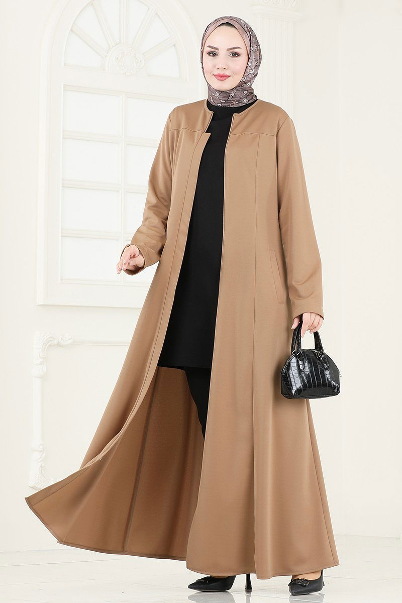 Detailed Abaya Coat is a model ideal for hijab clothing. This abaya coat is suitable for all seasons and can be washed at 30 degrees without wringing. It is made of knitted dabıl fabric. The product has a bicycle collar, is unlined, and has a front zipper. (The product on the model is size 38.) Height: 160 cm, Chest: 86 cm, Waist: 68 cm, Hips: 95 cm, Weight: 55 kg. It also has pockets.
