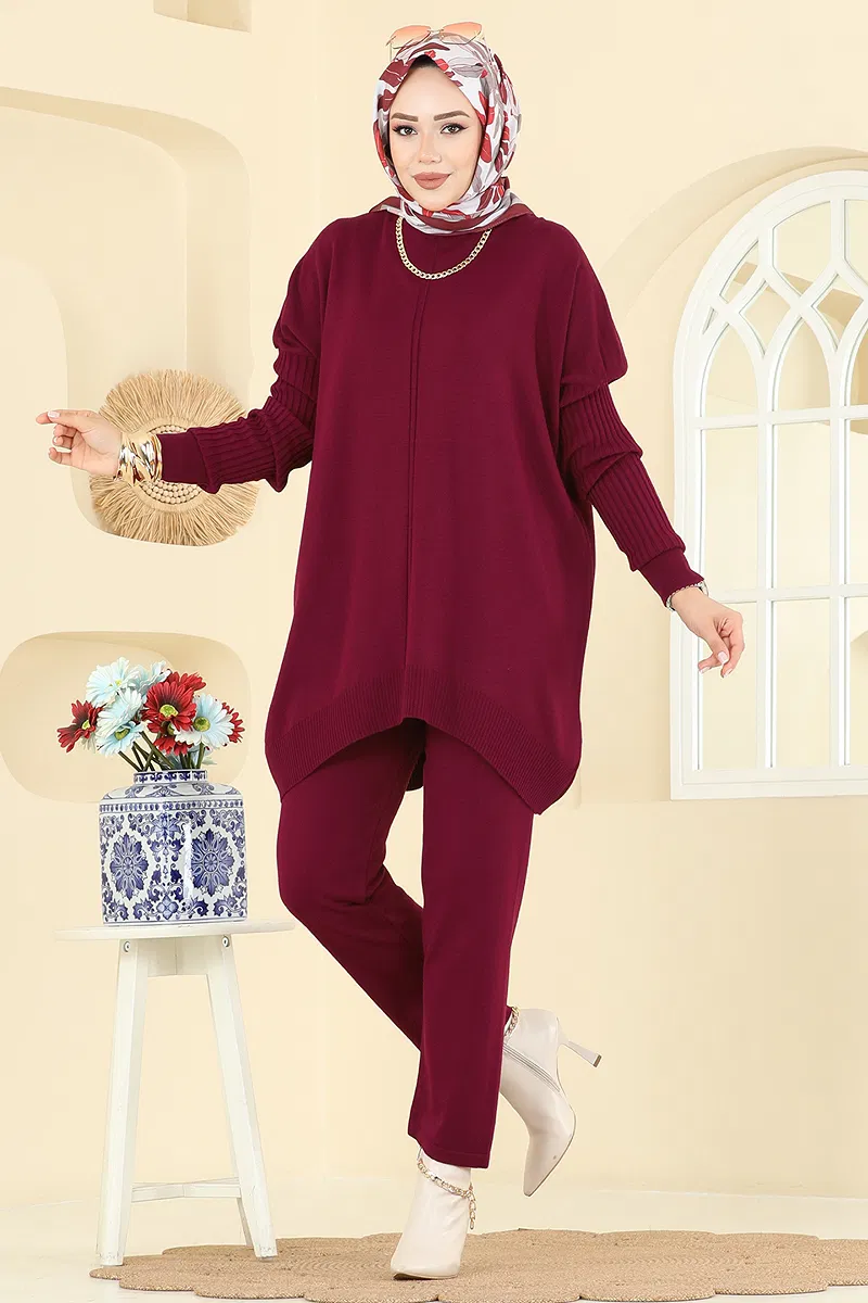 Boğazlı İkili Triko Takım Bordo