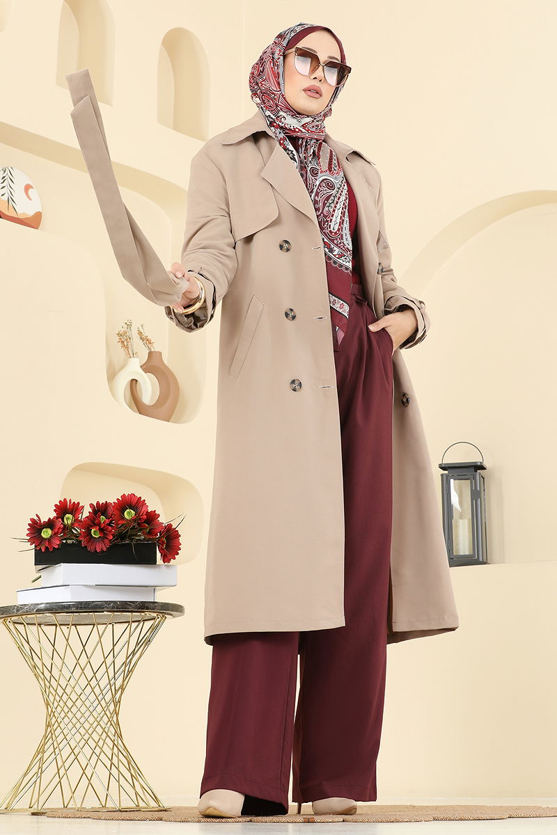 Ürün Adı: Bolero Detay Kuşaklı Trençkot. tesettür tarzında olup sonbahar ve kış sezonlarında rahatça kullanılabilir. 30 derecede hassas yıkamaya uygun olan bu trençkot, dayanıklı Amozon kumaştan üretilmiştir. Kruvaze yaka ve ön düğme detaylarına sahip olan ürün, astarlıdır ve rahat bir kullanım sunar. Modelin üzerindeki 38 beden örnek alınabilir. Kemer, dalgalanmayı önleyecek şekilde iki ucu dikilmiş orta kısım boş bırakılarak tasarlanmıştır. Kemer, ürünle birlikte gelmektedir ancak kullanımı opsiyoneldir. Ayrıca, pratik kullanım için cepler de mevcuttur.