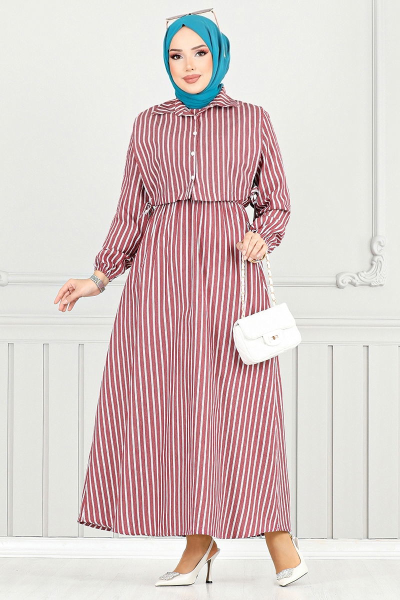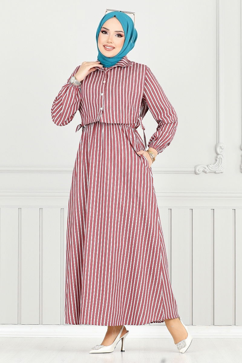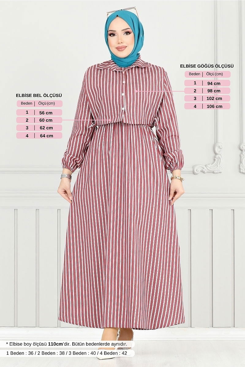 Bolero Görünümlü Elbise modeli; dört mevsim rahatlıkla kullanabileceğiniz, poplin kumaştan üretilmiş ve hassas yıkama ile bakımı yapılabilen bir tesettür giysi seçeneğidir. Gömlek yaka ve ön düğme detayları ile şık bir görünüme sahiptir. Bolero ve elbise bir arada tasarlanmış bu model, beli ve manşeti lastikli olup, belinde bağcıklar ve pratik kullanım için cepler de eklenmiştir. Astarsız yapısı ve sırttan fermuarlı tasarımıyla da konfor sunar. Model 2 beden ölçüsündedir.