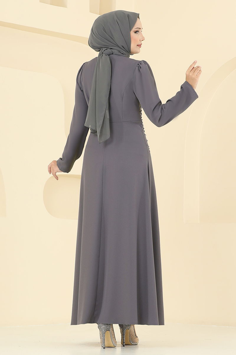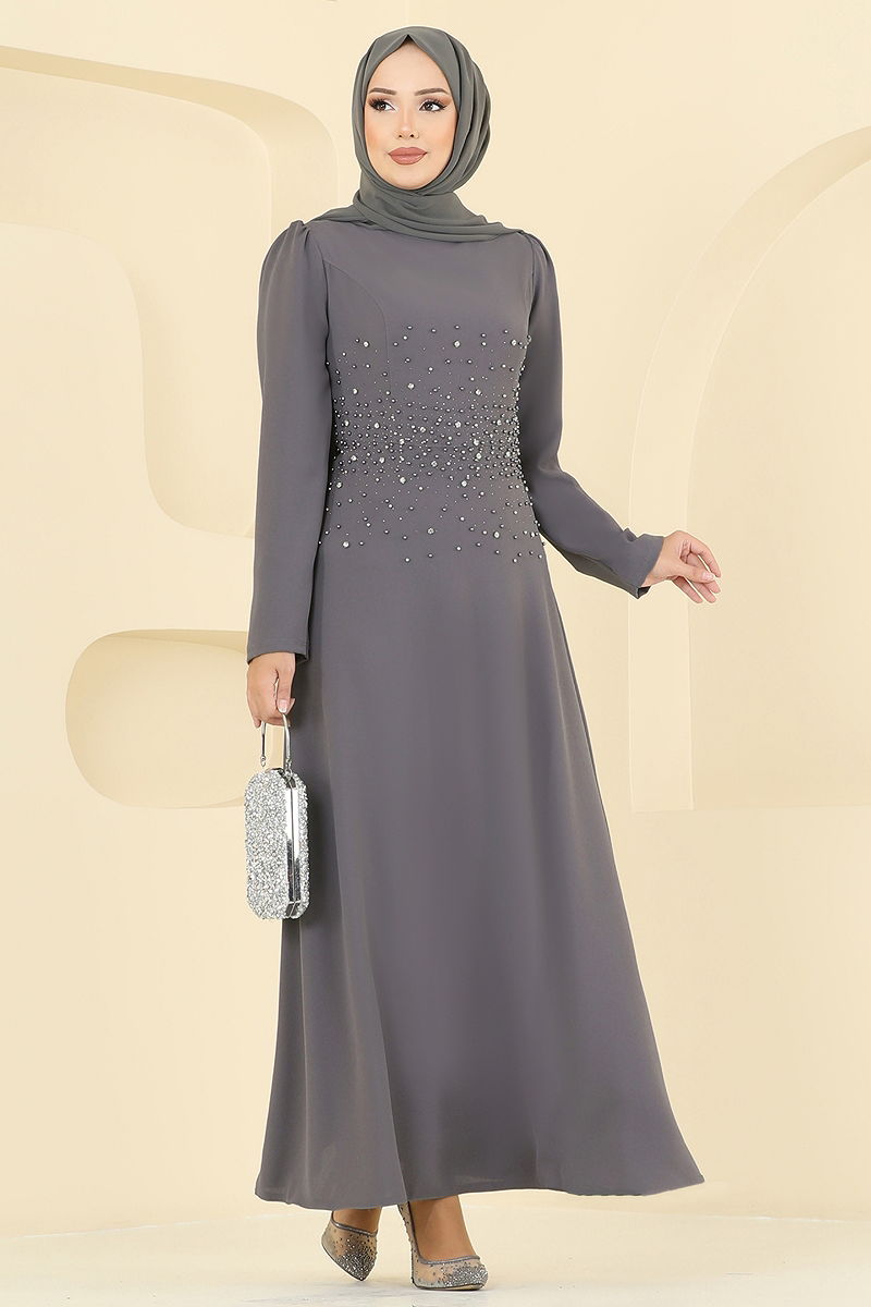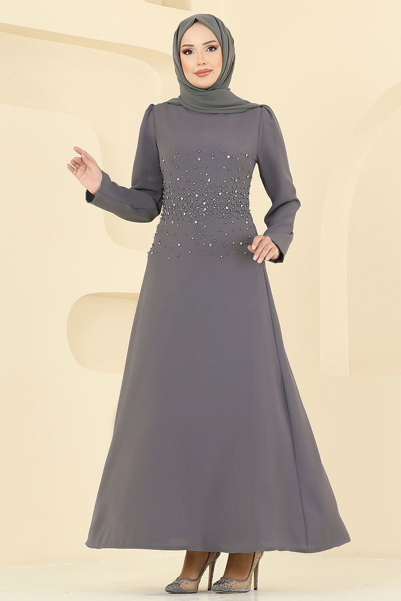 Boncuk Detaylı Krep Abiye 2727SL432 Antrasit