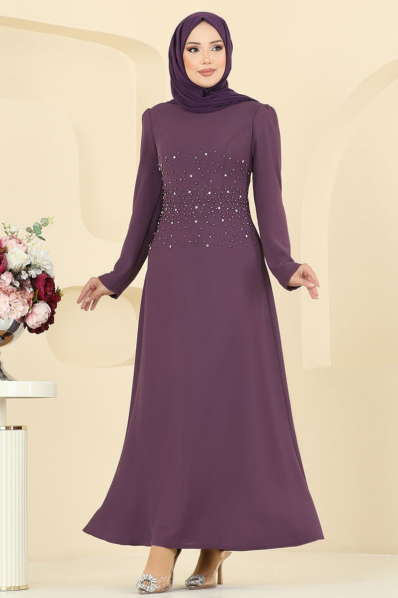Boncuk Detaylı Krep Abiye 2727SL432 Koyu Lila