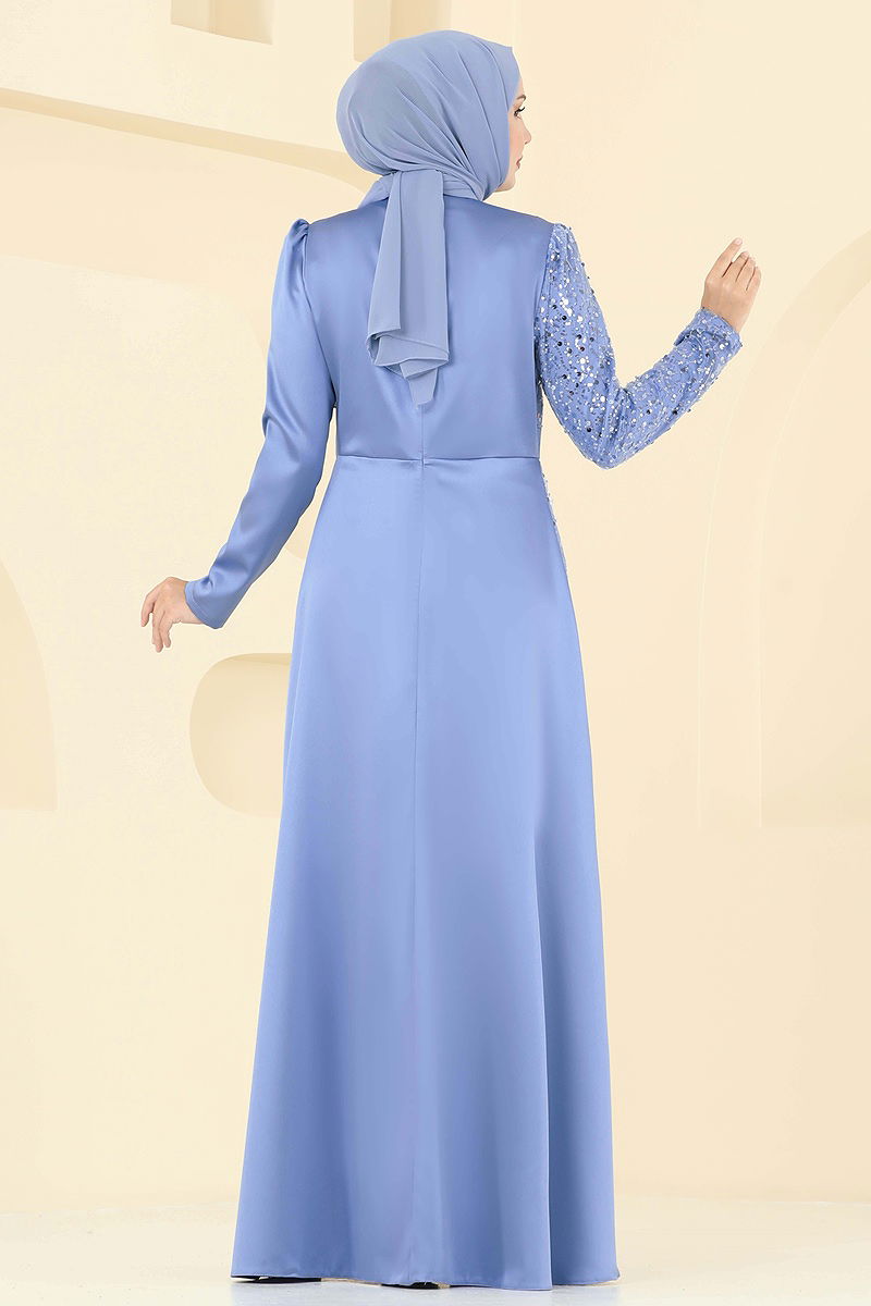 Boncuk Detaylı Saten Abiye 2818ELC1143 Mavi