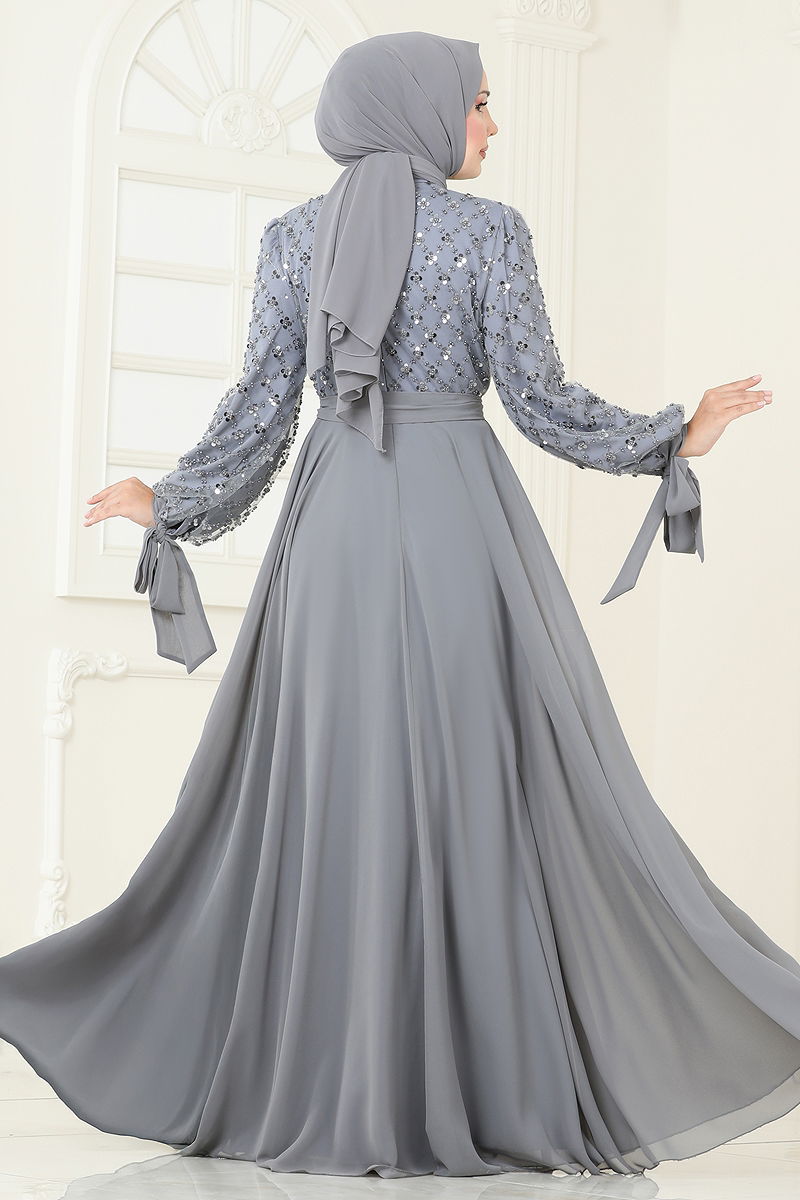 Boncuk Detaylı Şifon Abiye Gri