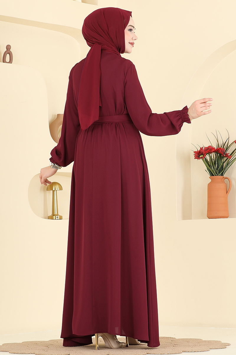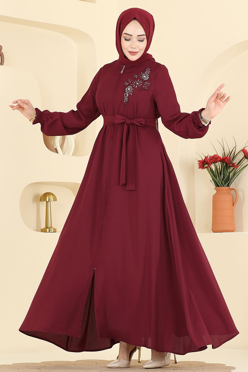 Boncuk İşlemeli Krep Ferace 8237AB368 Bordo