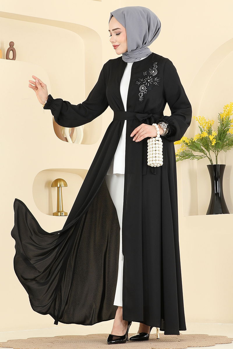 Boncuk İşlemeli Krep Ferace 8237AB368 Siyah