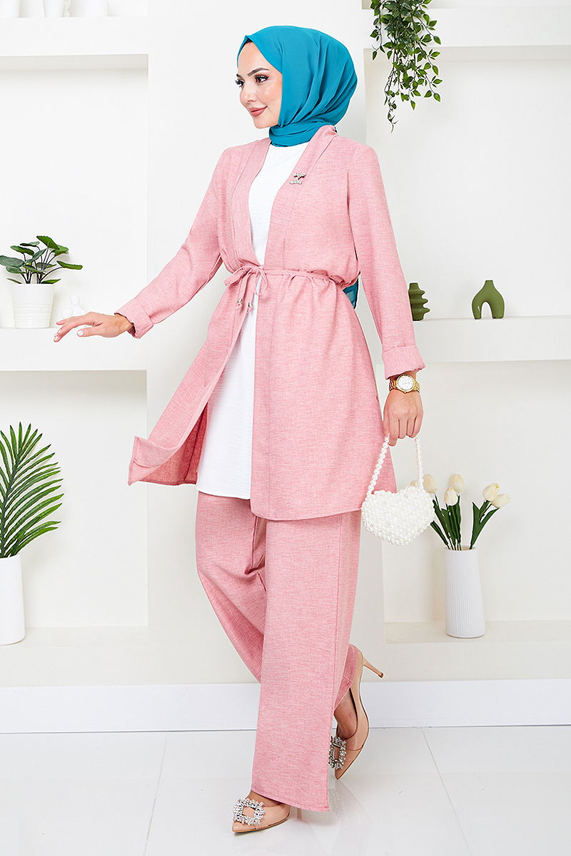 Brooch Detailed Linen Suit 4718ZNK903-M Rose Dried