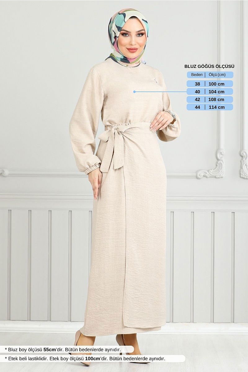 Broş Detay Etekli Takım , dört mevsim rahatlıkla kullanabileceğiniz şık bir tesettür ürünüdür. Keten kumaştan üretilen bu takım, 30 derecede hassas yıkama ile temizlenebilir. Bisiklet yaka ve astarsız tasarımıyla modern bir görünüm sunar. Ürüne dikili kemer ve çıkarılabilir broş detayı ile stilinizi özelleştirebilirsiniz. Etek beli lastikli ve bağcıklıdır, bluz manşeti ise lastiklidir.