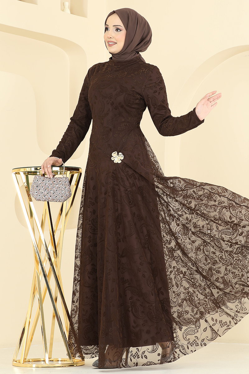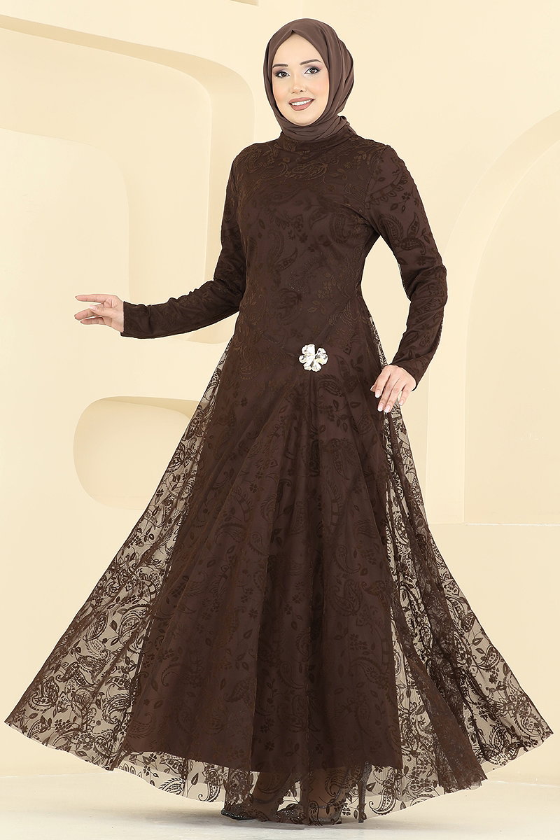 Broş Detaylı Dantel Elbise 5805EDFK1198 Kahve