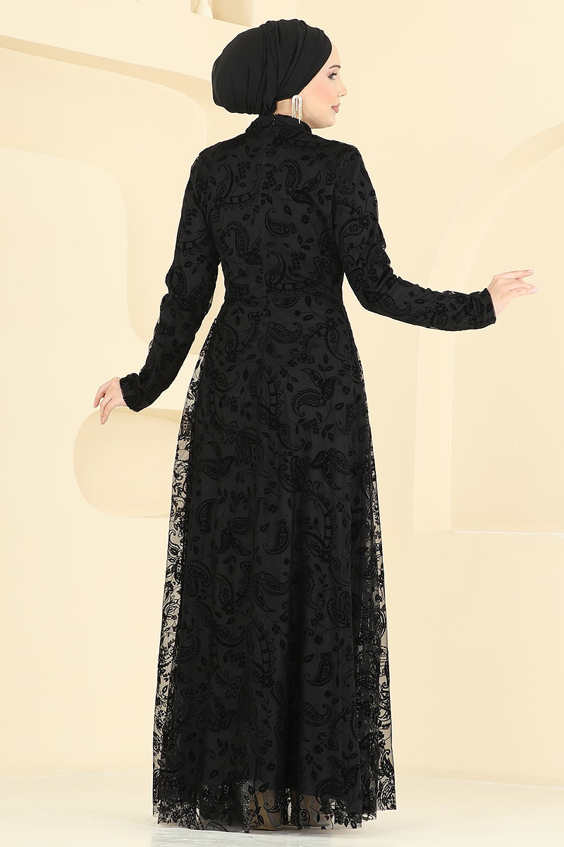 Broş Detaylı Dantel Elbise 5805EDFK1198 Siyah