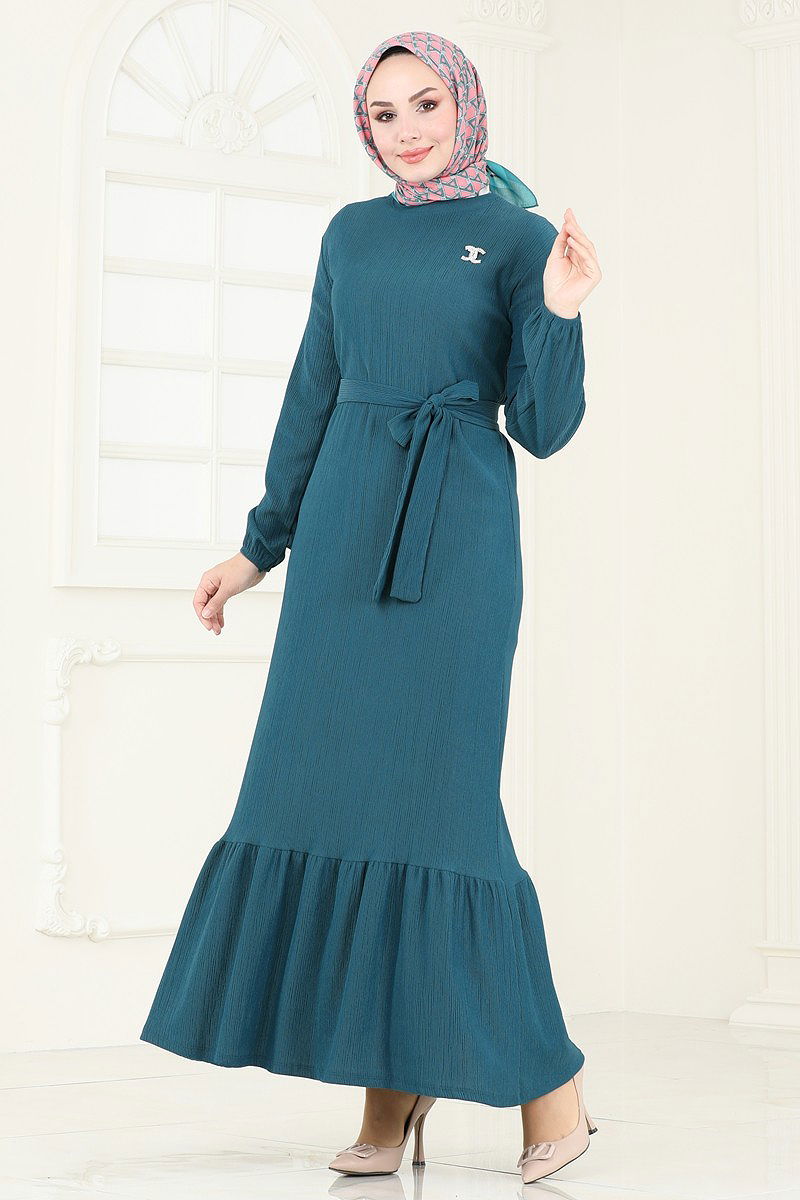 Broş Detaylı Şık Elbise model tesettür ürünüdür. Sonbahar ve Kış sezonunda kullanılabilir. 30 derecede sıkma yapılmadan yıkanmalıdır. Birinci sınıf Karen kumaştan imal edilmiştir. Ürün Bisiklet yakadır. Astarsızdır. (Modelin üzerindeki ürün 38 bedendir.) Kemerin dalgalanmaması için iki ucu dikilmiş, orta kısım boş (dikişsiz) bırakılmıştır. Kemer ürüne dahildir, isteğe bağlı kullanılmayabilir. Broş ürüne dahildir, isteğe bağlı kullanılmayabilir. Manşet lastiklidir.Elbise kafadan giyilmektedir.