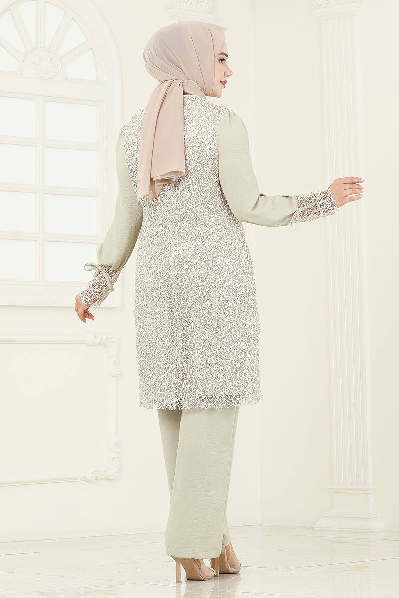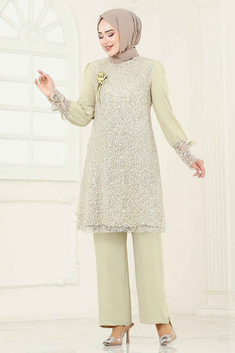Ürün Özelliği : Yeni sezon tesettür moda ürünüdür. Ürün Bisiklet yakadır. Astarsızdır. Ürün Sırttan fermuarlıdır. Aksesuar ürüne dahildir, isteğe bağlı kullanılmayabilir. Pul payet detayı dikilidir. Pantolon beli lastiklidir. Konsept fotoğraf çekimlerinden dolayı üründe ton farklılığı olabilir.