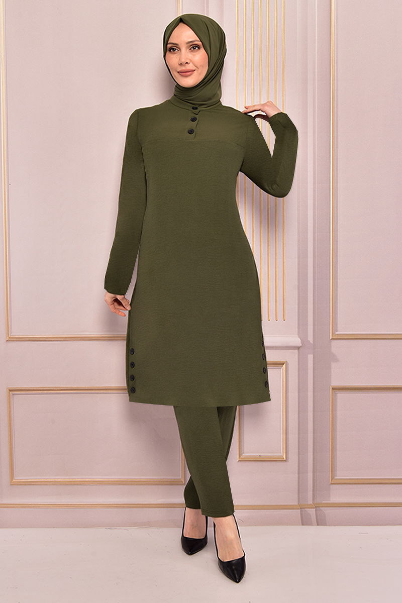 بدلة حجاب بأزرار كاكي اللون الكاكي