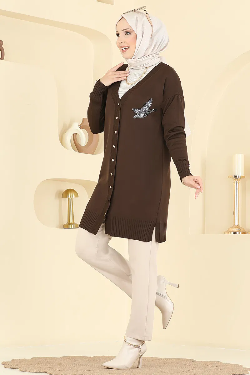 The Figure-Detailed Knit Cardigan is specially designed for modest wear. Suitable for both autumn and winter, this cardigan ensures you remain stylish. It is washable at 30 degrees due to its delicate structure and is made from mercerized knit fabric. Featuring a classic V-neck design, the cardigan is buttoned at the front and unlined. Available in standard sizes (36-38-40-42), it accommodates various body types. Cuff buttons and other accessory details complete the cardigan's elegant look.