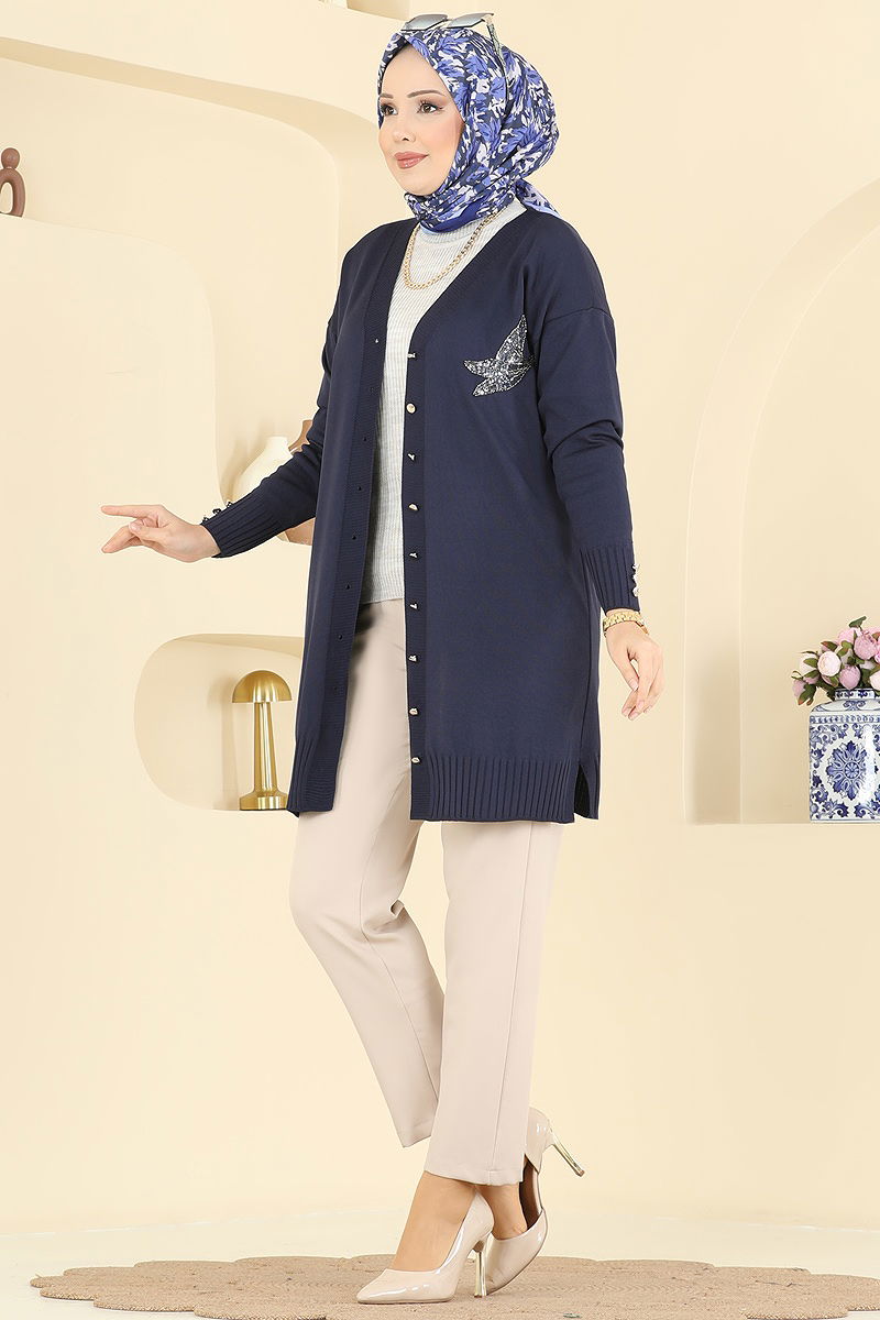 The Figure-Detailed Knit Cardigan is specially designed for modest wear. Suitable for both autumn and winter, this cardigan ensures you remain stylish. It is washable at 30 degrees due to its delicate structure and is made from mercerized knit fabric. Featuring a classic V-neck design, the cardigan is buttoned at the front and unlined. Available in standard sizes (36-38-40-42), it accommodates various body types. Cuff buttons and other accessory details complete the cardigan's elegant look.