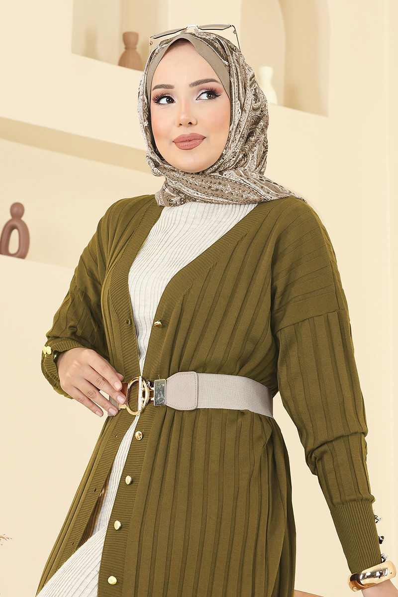 The Front Buttoned Knit Cardigan is specially designed for modest wear. Made from Mercerized Knit fabric, this cardigan ensures you stay stylish during the autumn and winter months. Its front-buttoned design and cuff accessory buttons offer a striking look. The unlined structure makes it light and practical. Available in a standard size, this piece is a must-have in every wardrobe.