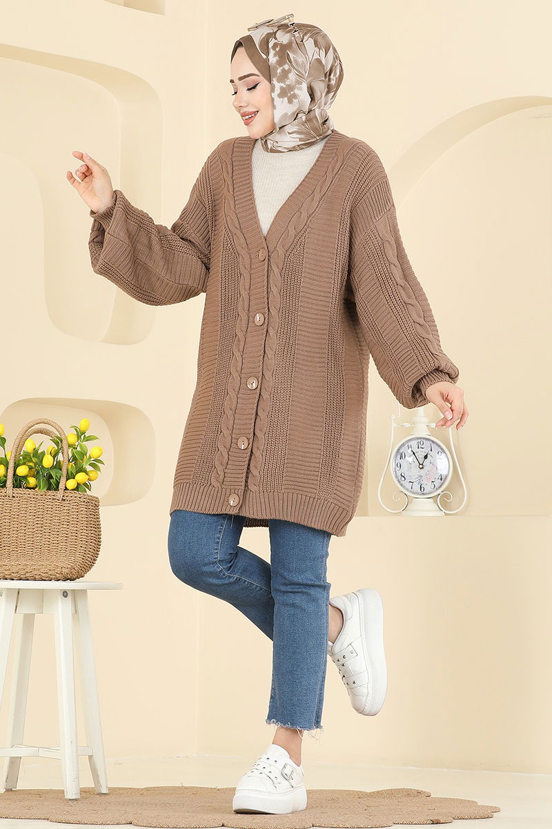 The Mid-Length Knitted Cardigan is an outerwear designed for modesty, perfect for autumn and winter. Easy to maintain with a gentle wash at 30 degrees, it's crafted from knitted fabric. Featuring a V-neckline and buttoned front for practicality, this cardigan is unlined, offering a light and comfortable experience. It fits standard sizes from 36 to 42.
